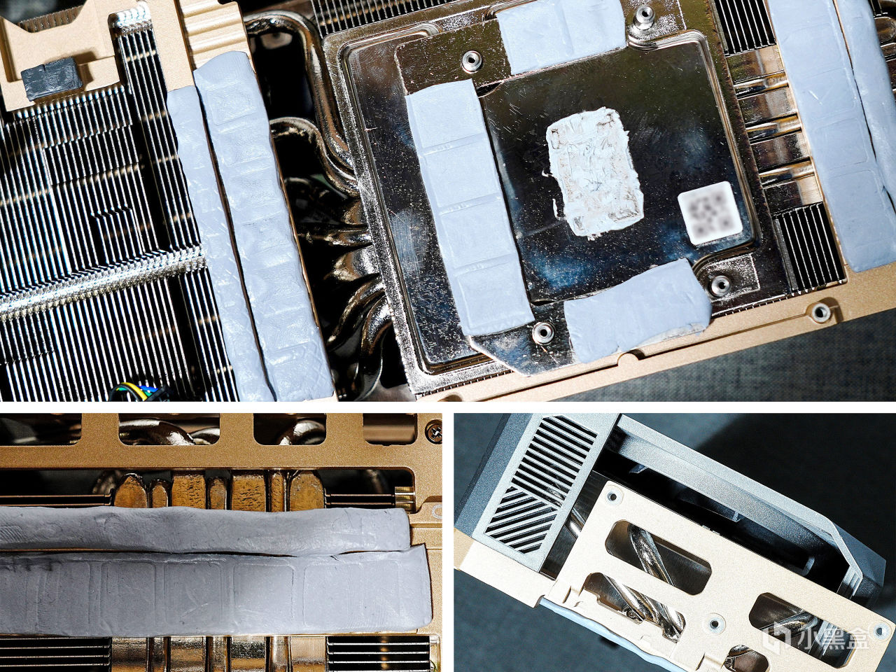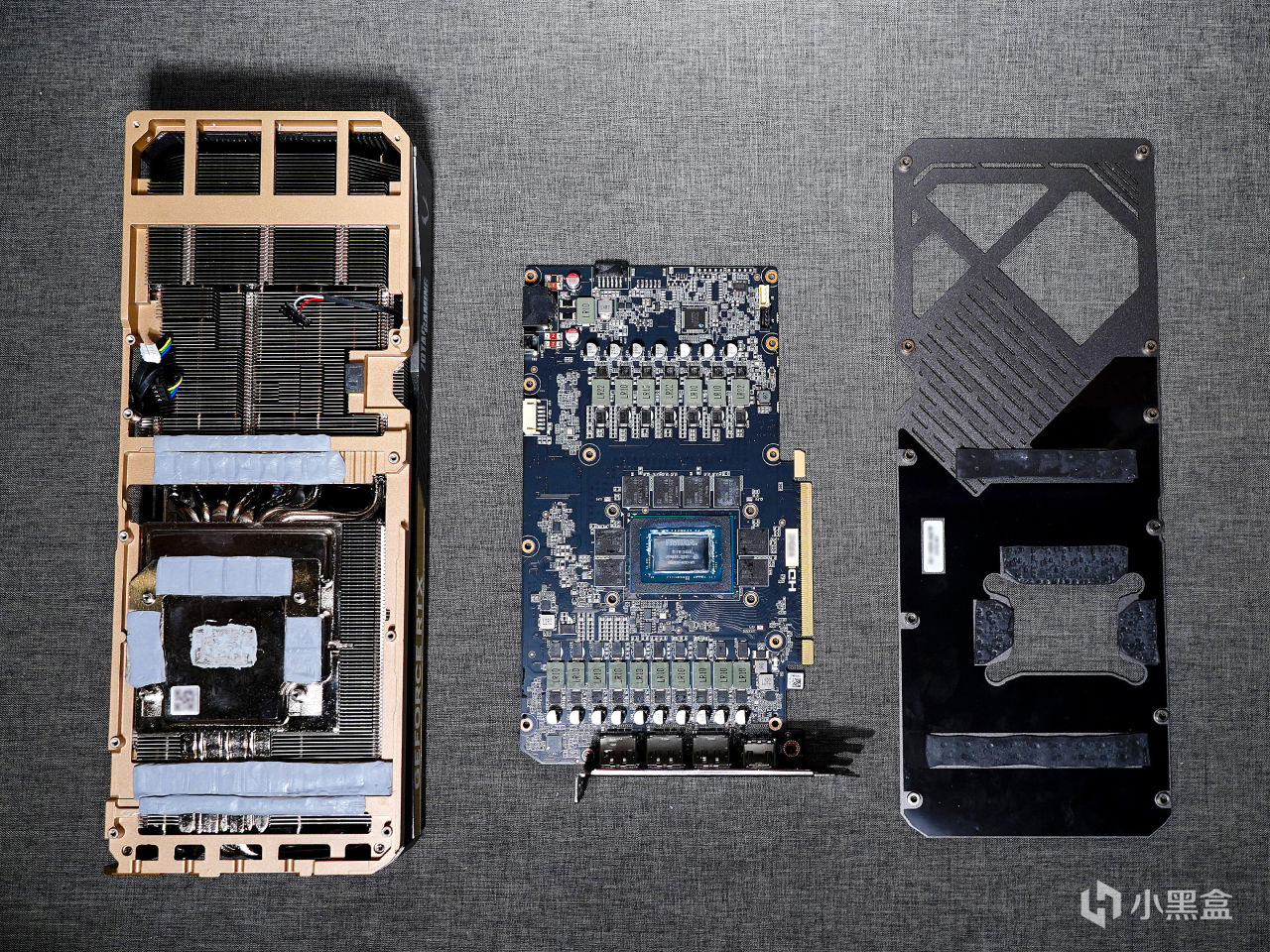 ▼簡單拆解下,背板內側有大面積的絕緣層以增加電氣性能的穩定性;散熱器部分爲均熱板+熱管的設計,而且均熱板也會負責顯存的導熱,另外散熱鰭片密度也是比較高的。相比之下,PCB就顯得小巧,不過在供電用料方面是不用爲索泰顯卡擔心的。