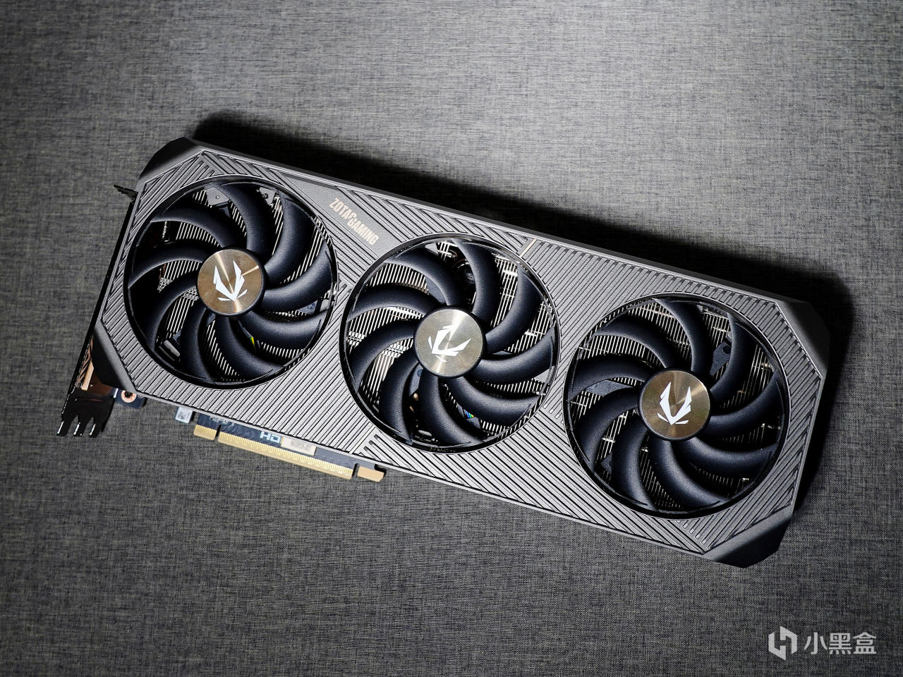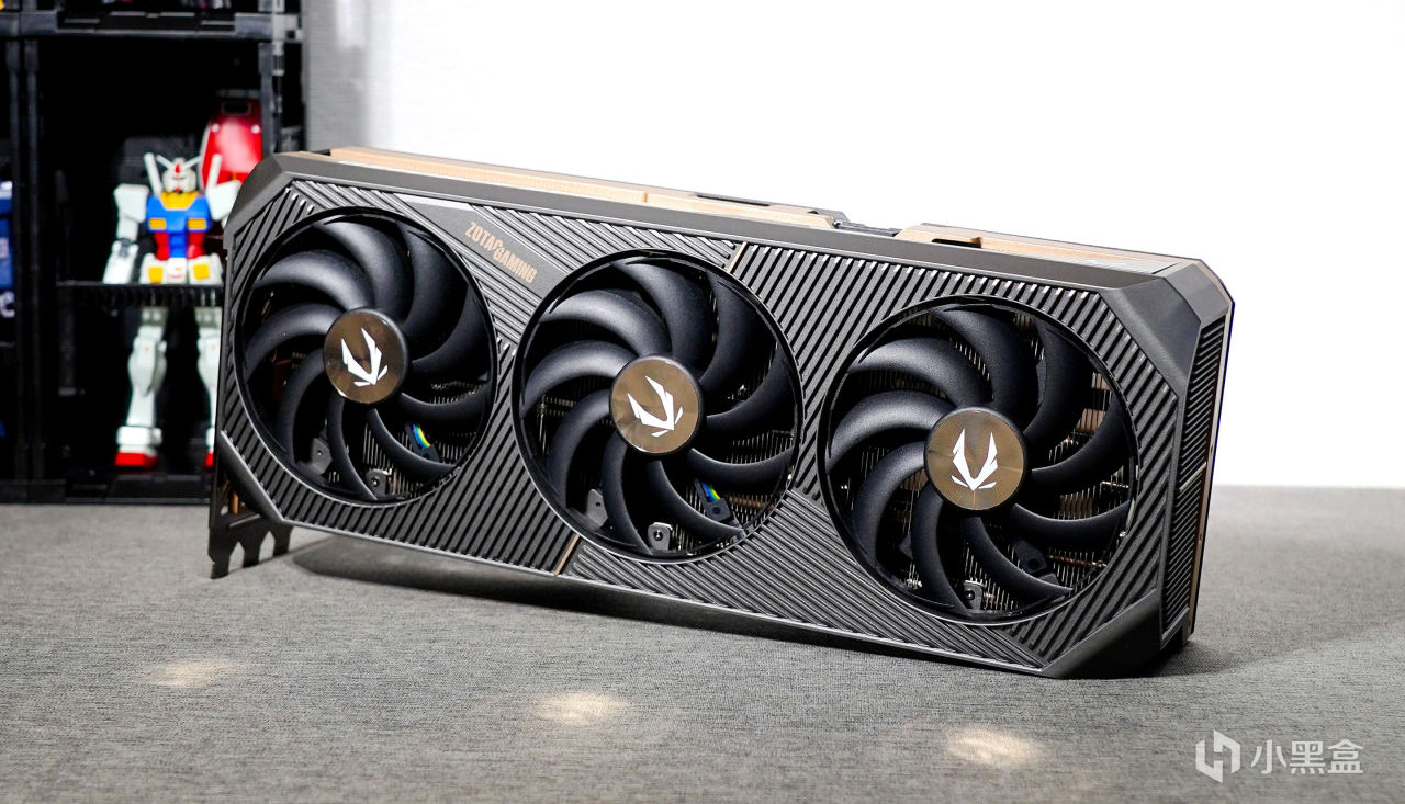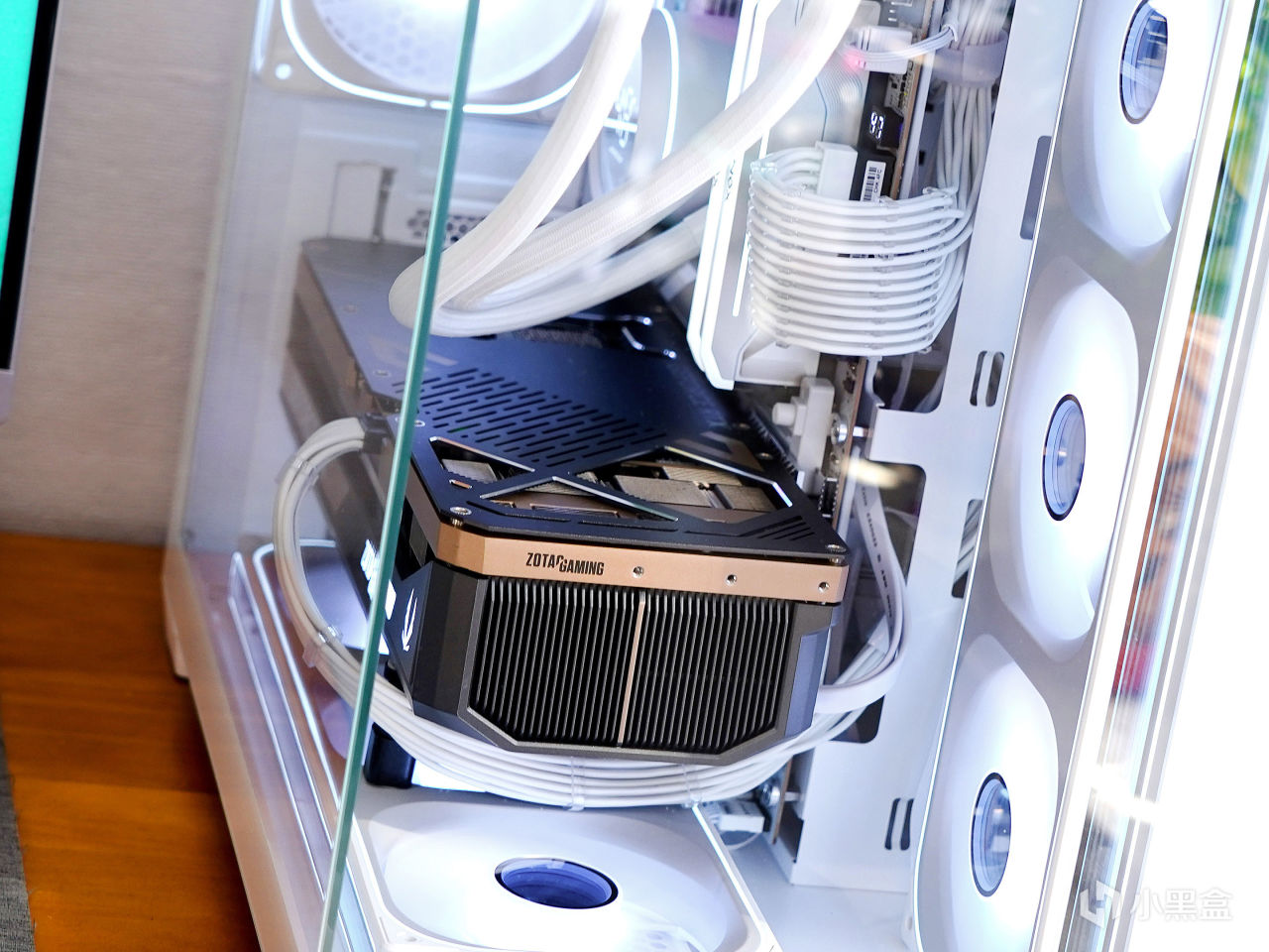 ▼風扇採用了三顆直徑爲9釐米的九葉環葉風扇。軸心也是古銅色的,並配有索泰的圖形LOGO,除了支持智能啓停以外,還可以通過軟件獨立控制每個風扇的轉速,精準控制噪音和溫度的平衡。
