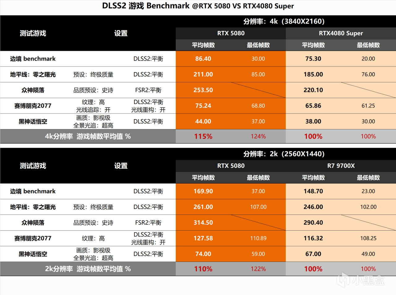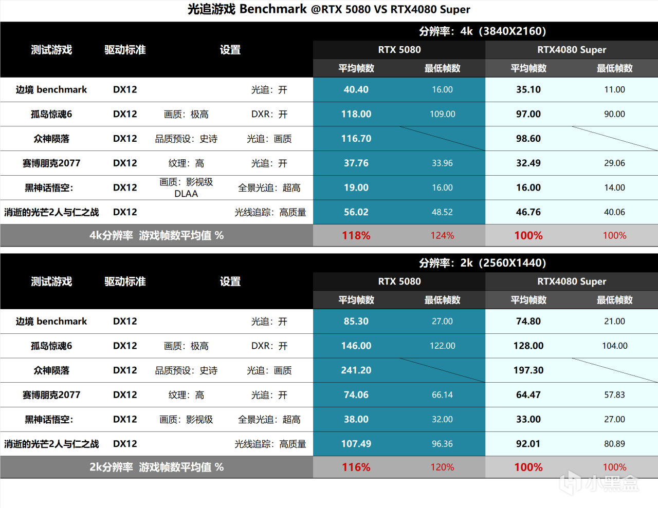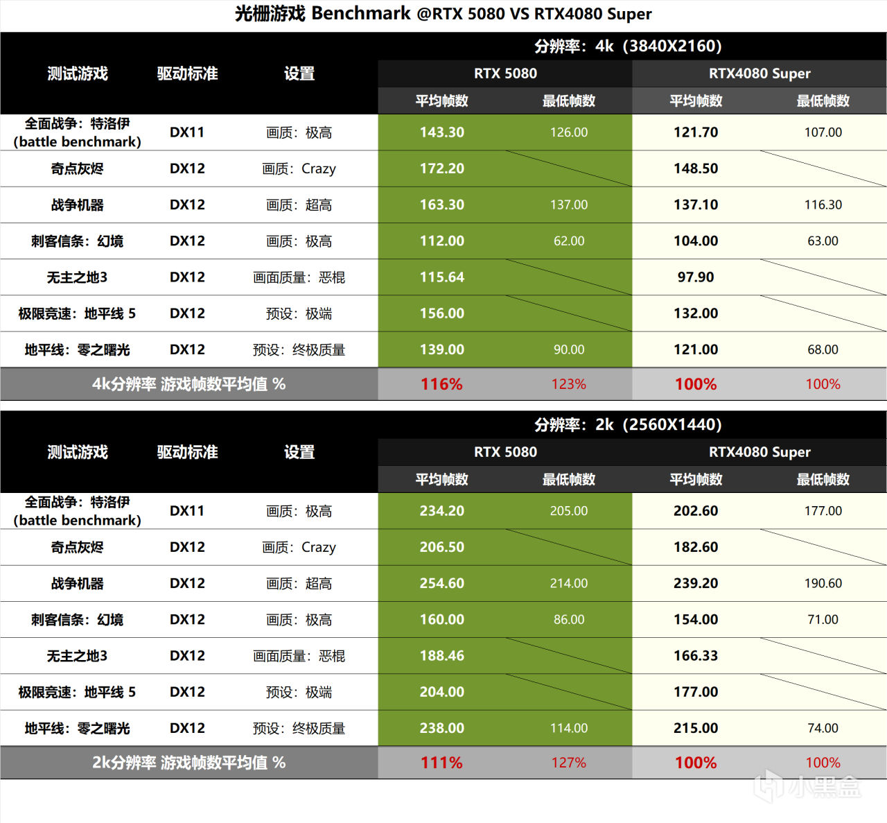 ▼4k分辨率,RTX5080領先RTX4080s達到18%;到了2k分辨率,RTX5080領先RTX4080s爲16%,和光柵遊戲的情況類似,但分辨率的影響弱了一些。