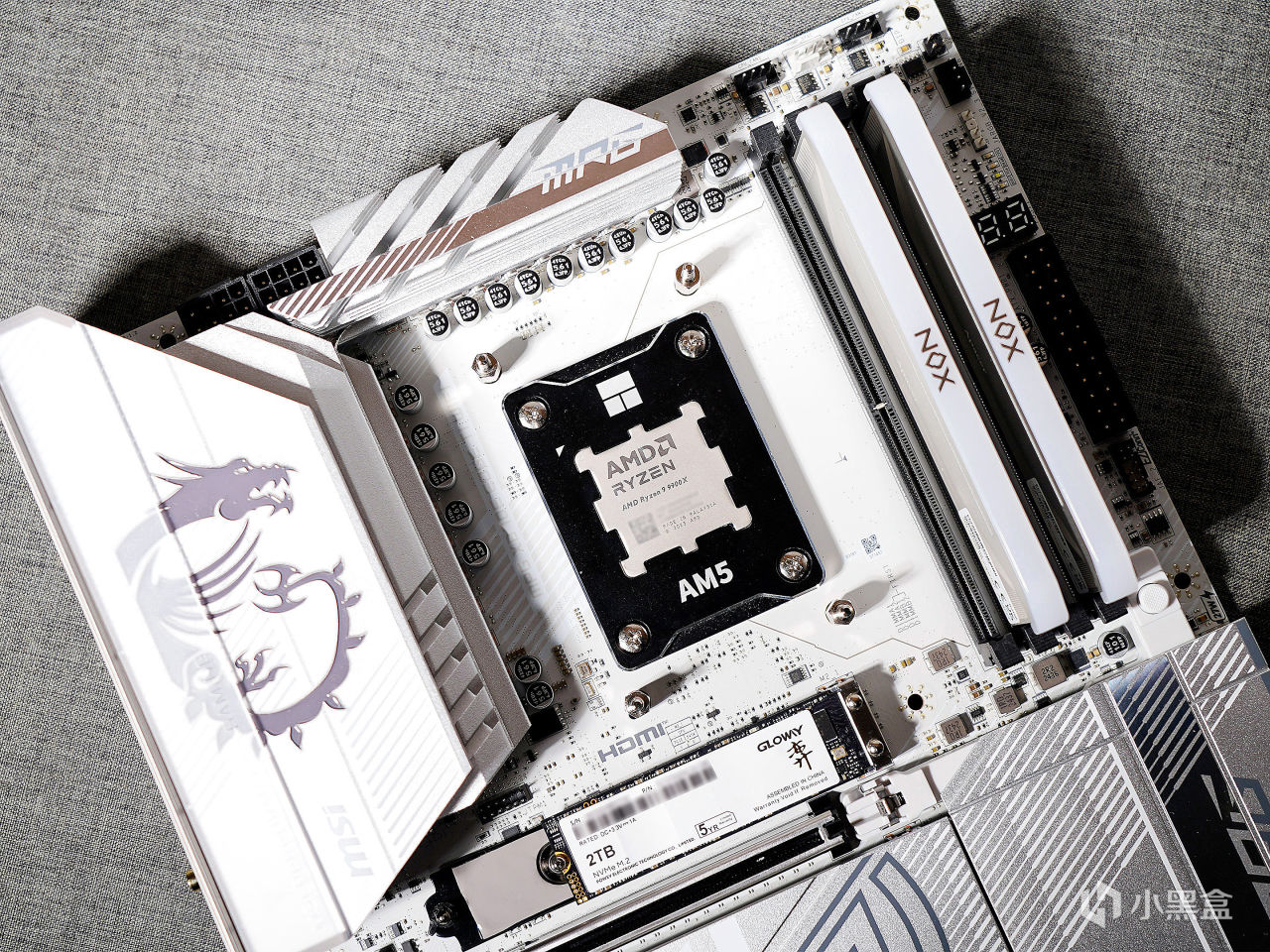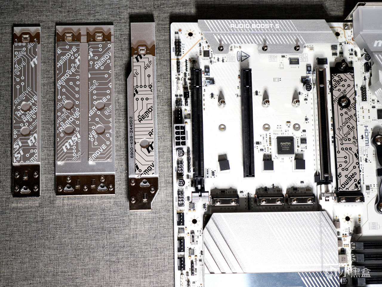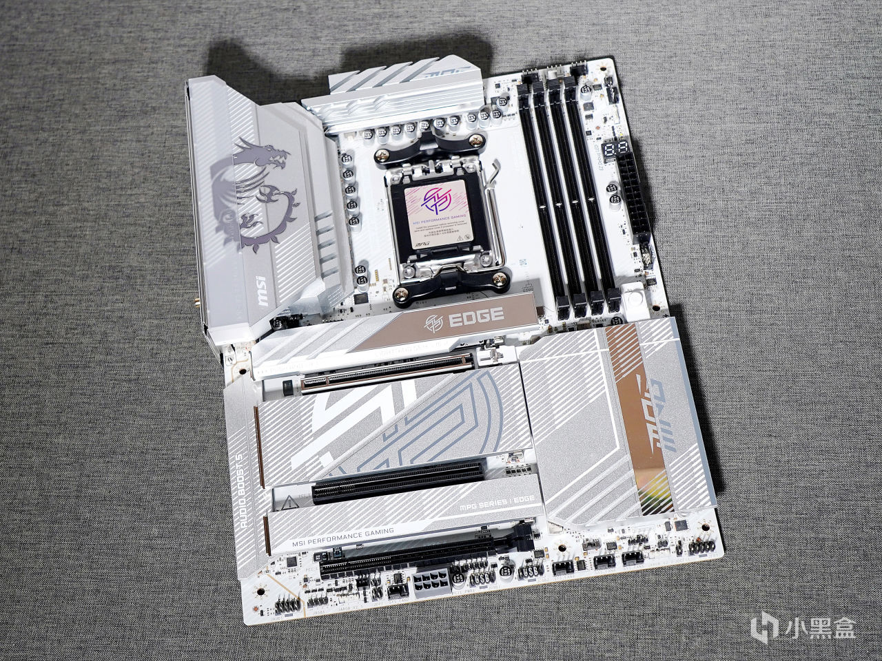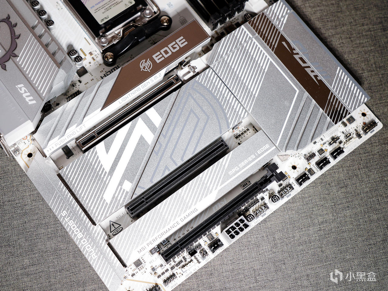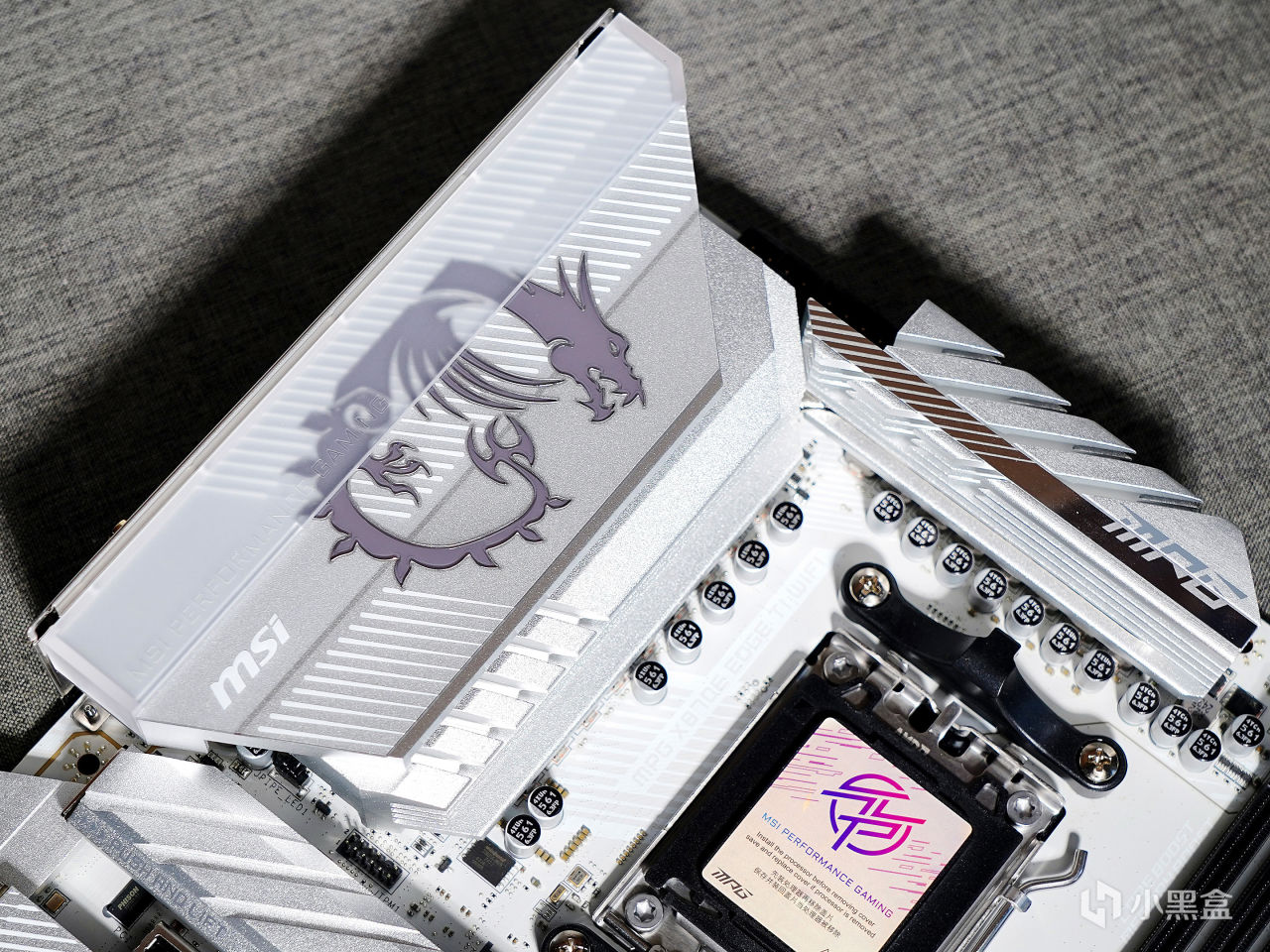 ▼X870E 刀鋒鈦主板唯一有光效的地方就是右側護甲上的微星龍盾圖形LOGO。