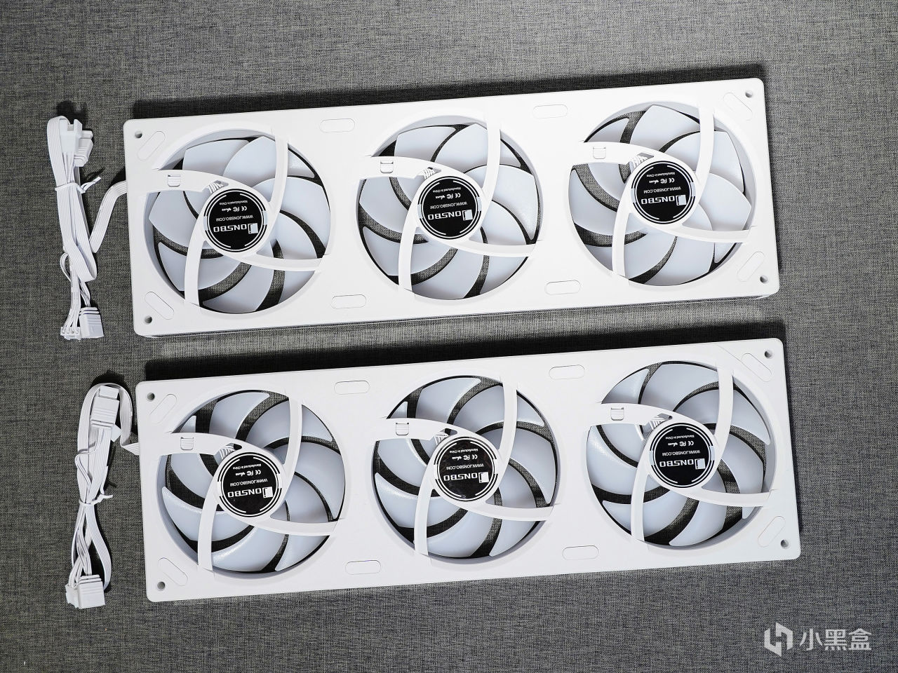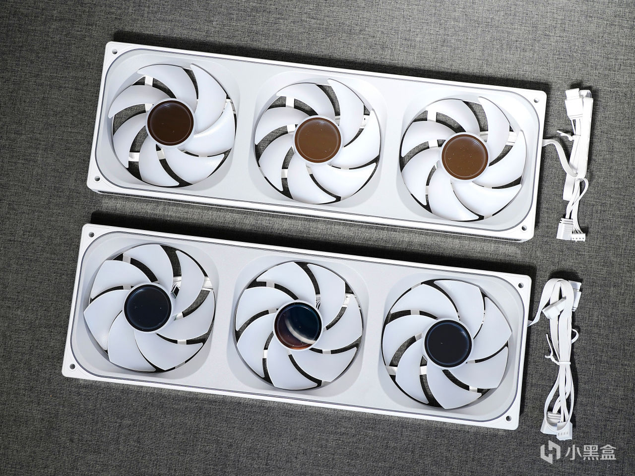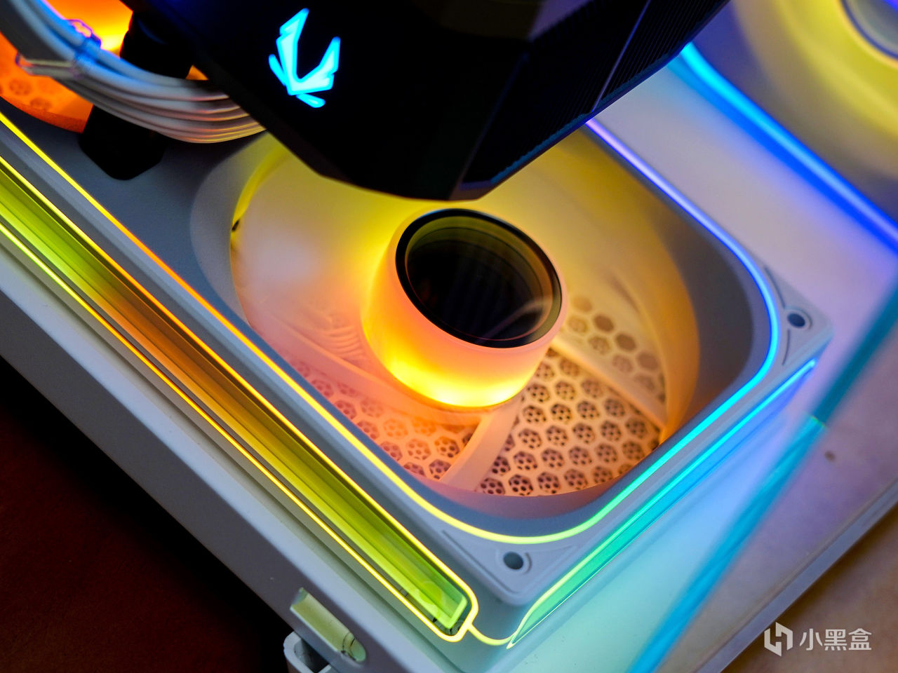 ▼這款水冷標配了聯體式風扇,3個風扇僅需一組接口就可以了,大大減少理線的工作。風扇具體參數爲:轉速 700-2400rpm,風量 21.46-62,4CFM,噪音 21.3-37.3dBA,具有ARGB燈效。風扇四個側面有鏡面,通電後也有光效,讓顏值更上一層樓。