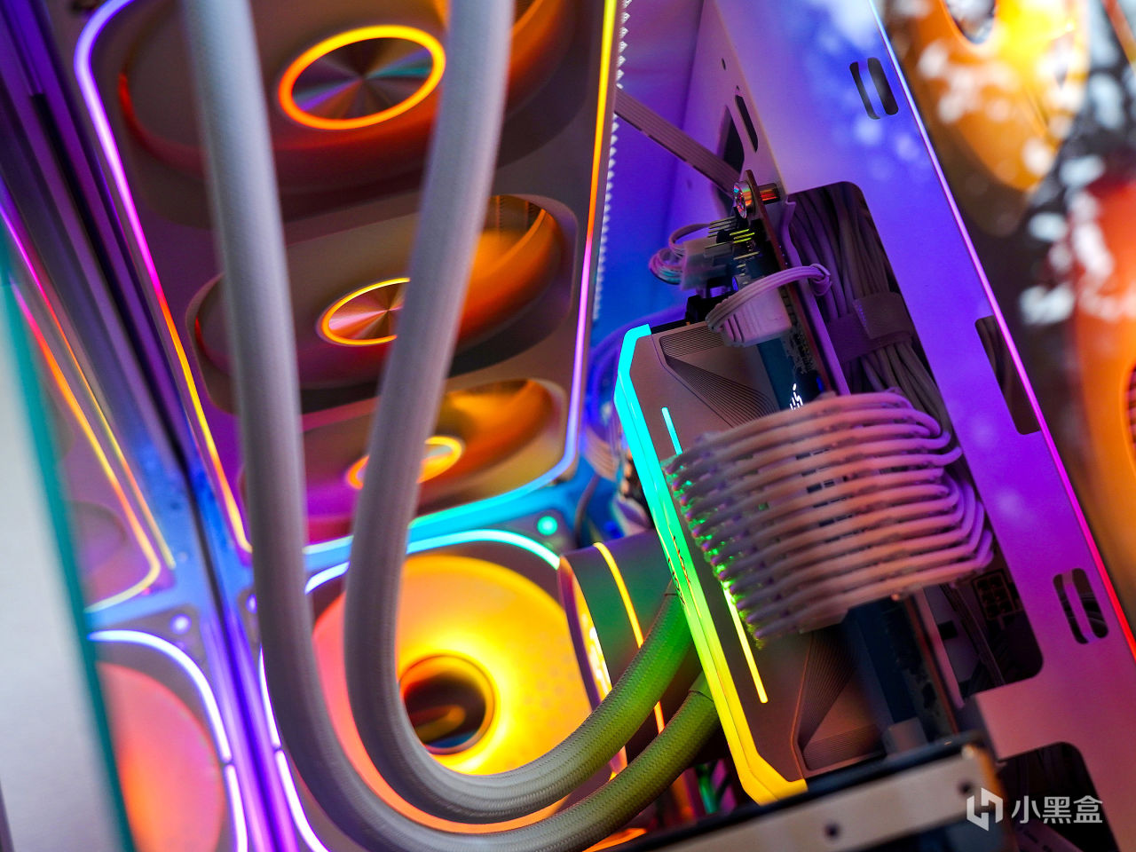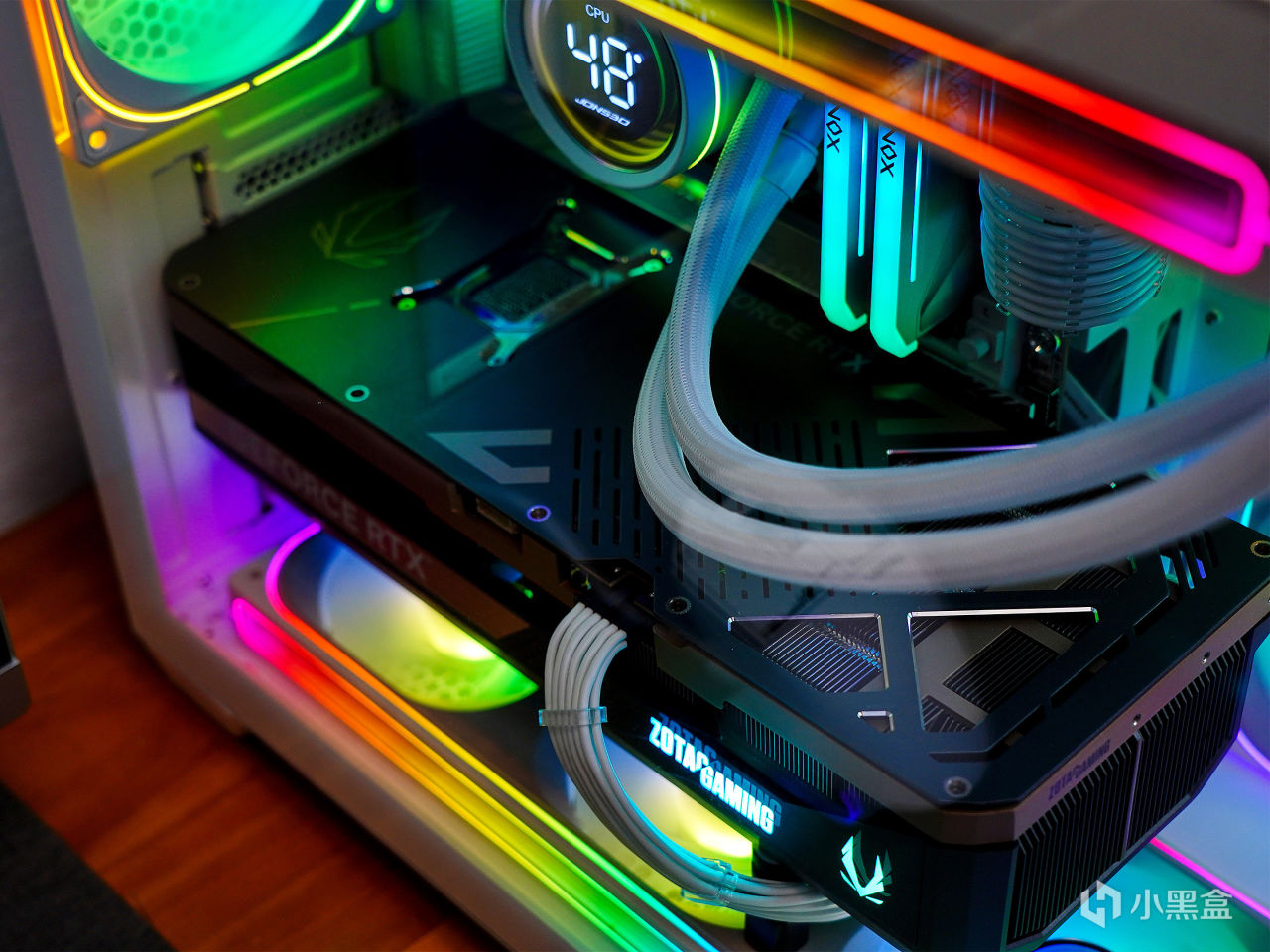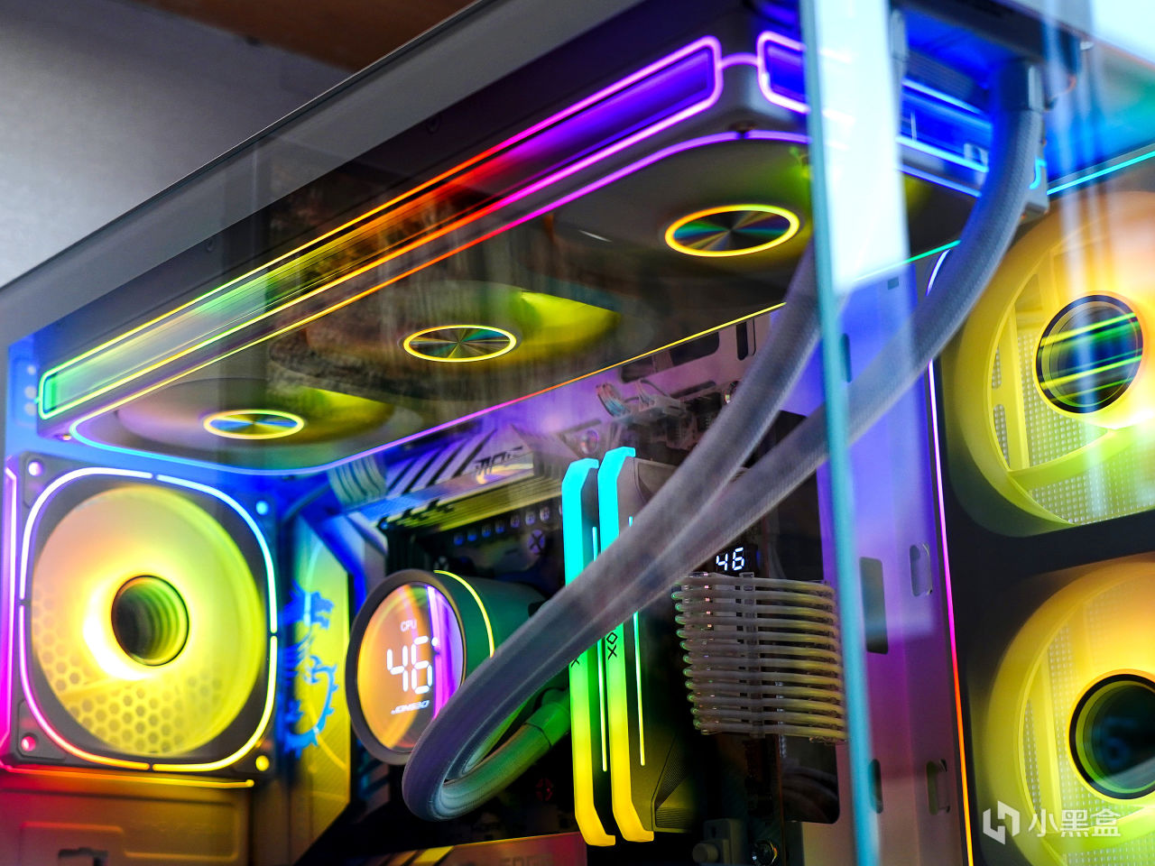 ▼海景房主機的內部硬件相比一般側透機箱會被更清晰地展示出來,這次的硬件只有顯卡不是白的,稍不完美,下面來看看開機後的ARGB效果。
