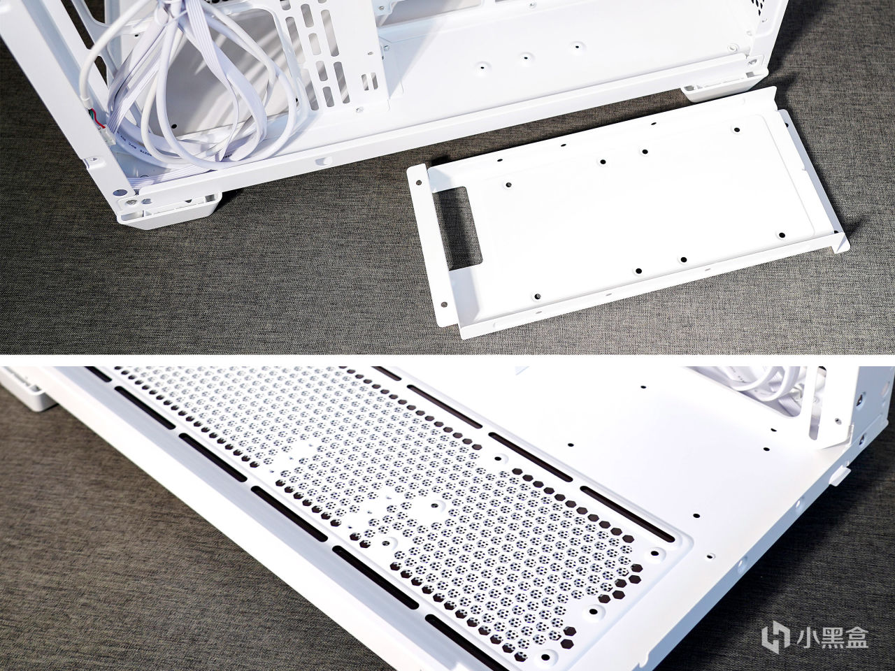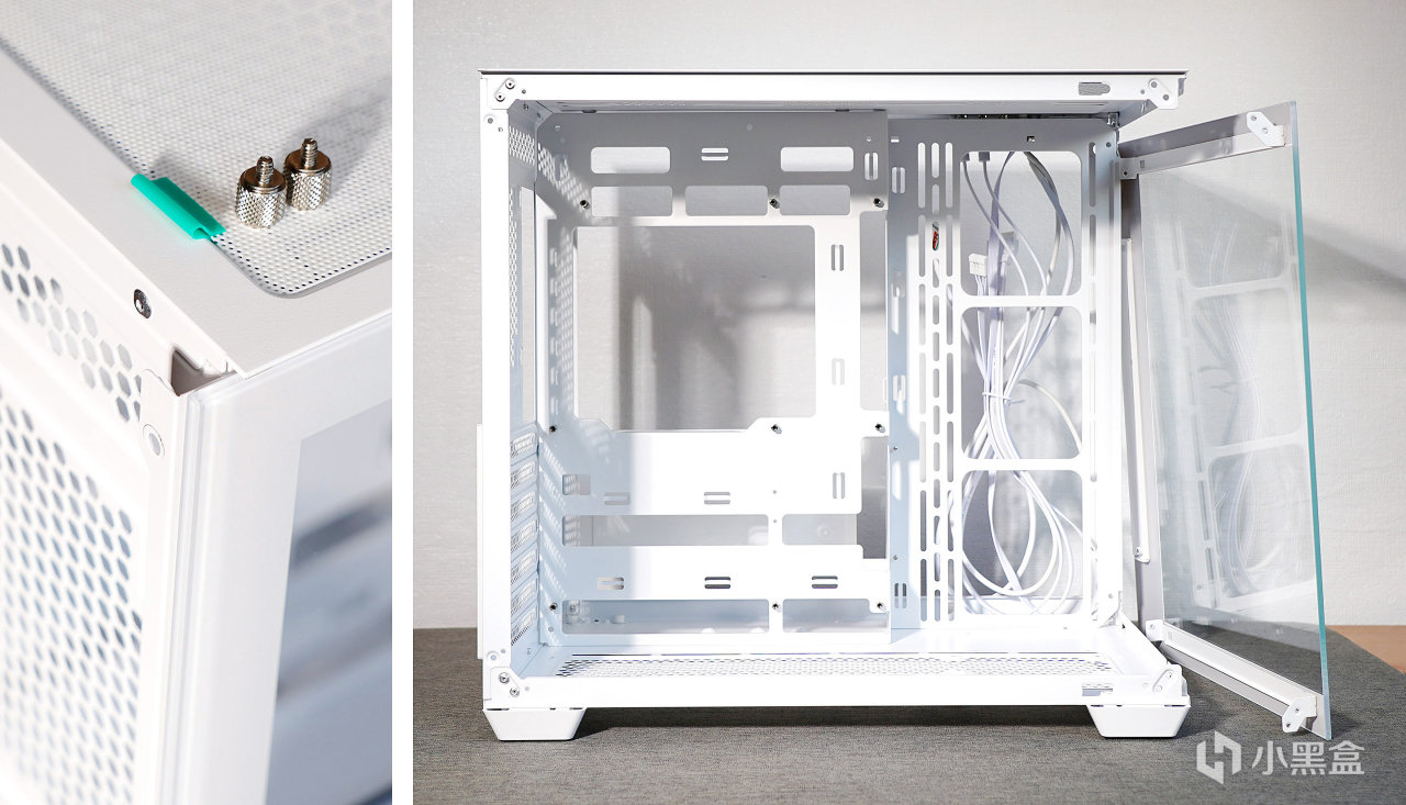 ▼左側面板拆下手擰螺絲,向後一拉就可以打開,但無防丟設計;前面玻璃板則需要拆下多顆螺絲才能取下,但不拆也不影響裝機。兼容性方面最大支持ATX主板,並支持背插系統,CPU風冷散熱器最高支持163mm,顯卡最長到410mm,主機板前側部最大隻能支持280mm的冷排,或3個120mm風扇;底部支持360mm冷排,但不能安裝280mm的冷排或140mm的風扇。