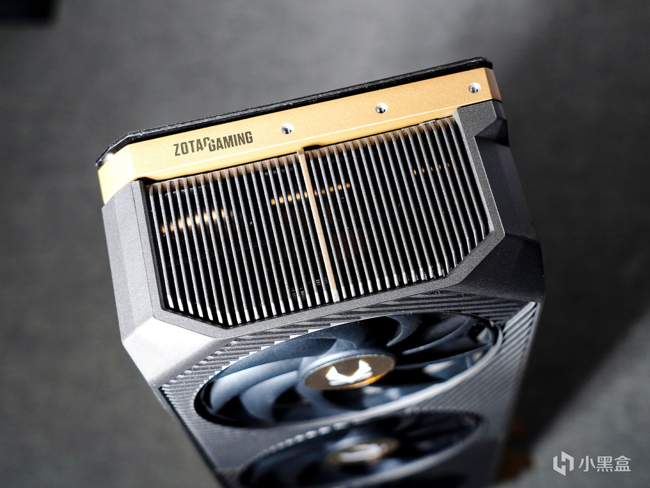 ▼前端通風設計很像汽車的進氣格柵,合金中框上有ZOTAC GAMING的字樣,旁邊有三個螺絲孔位,是用來安裝顯卡支架的。
