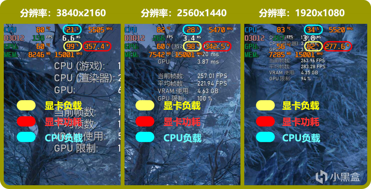 ▼隨着RTX5080使用分辨率的降低,顯卡(GPU)負載下降,功耗也下降,相當於顯卡的性能也隨之下降!同時也可以看到CPU負載隨着分辨率的降低小幅度上升,說明分辨率越低,CPU內存等越容易成爲瓶頸。所以RTX5080的建議使用環境就是4k分辨率高刷,千萬不要在1080p分辨率下使用。