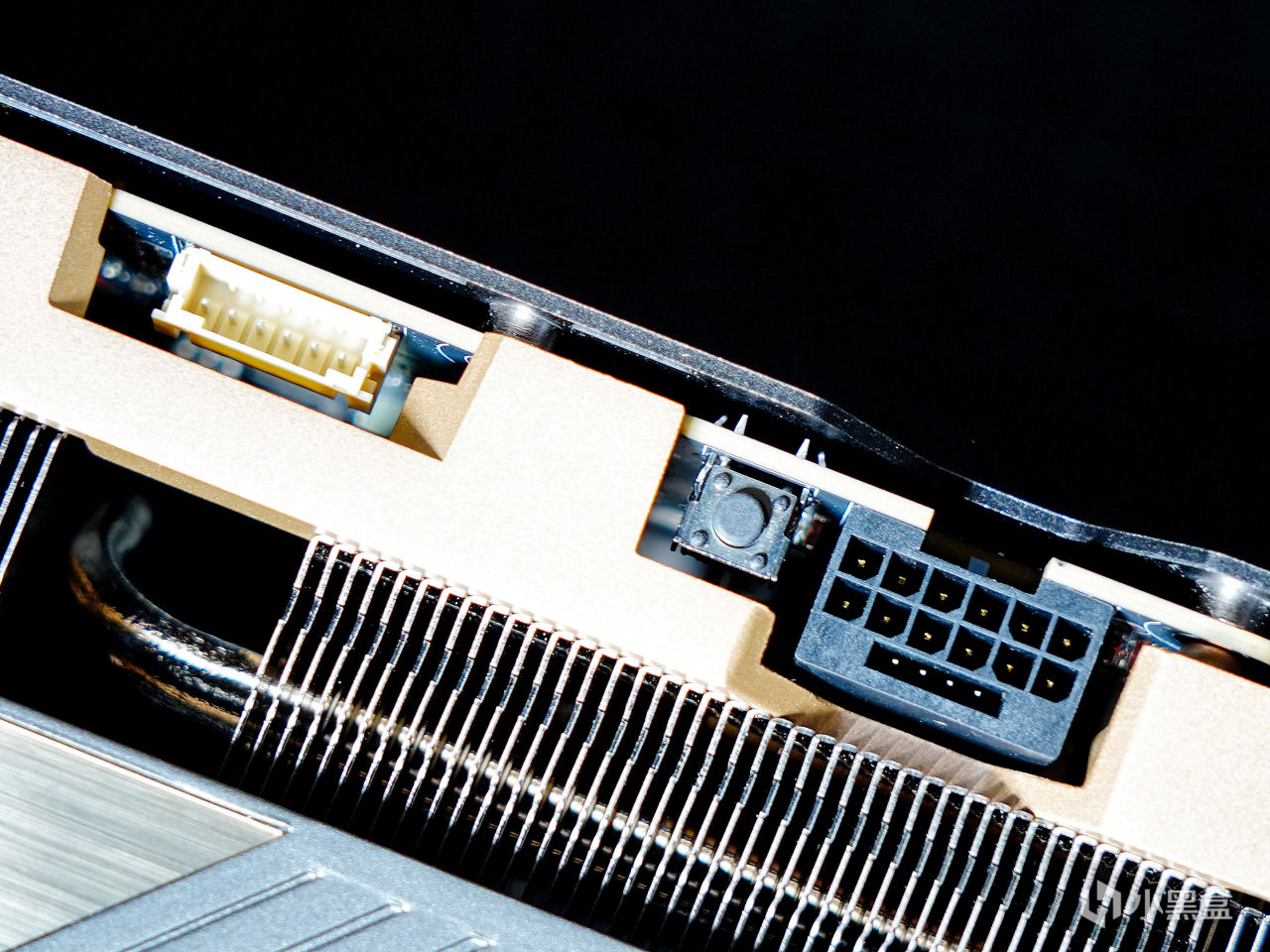 ▼側面有反向的12V-2X6 16P供電接口,旁邊有一個黑色的小開關是BIOS切換鍵 ,兩個bios頻率一樣,只是風扇控制模式不同,一個風扇轉速高,主打性能,一個風扇轉速低,主打靜音。左側的白色接口爲ARGB的幻光同步接,連接主板後可以讓顯卡燈效與其他PC硬件實現燈光同步。