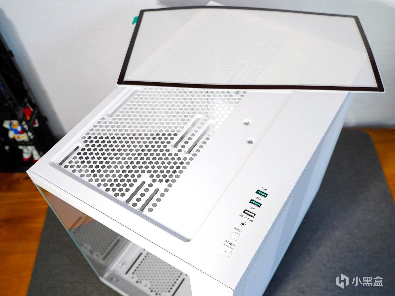 ▼頂部最大支持360mm/280mm規格冷排,或者3個120mm/2個140mm風扇的安裝,也配有磁吸防塵網。I/O面板在頂部的右前側,提供了2個USB3.,1個USB2.0,3.5mm二合一音頻接口,重啓鍵,開機鍵。都5202年了,沒有配備Type-C接口確實不太應該。