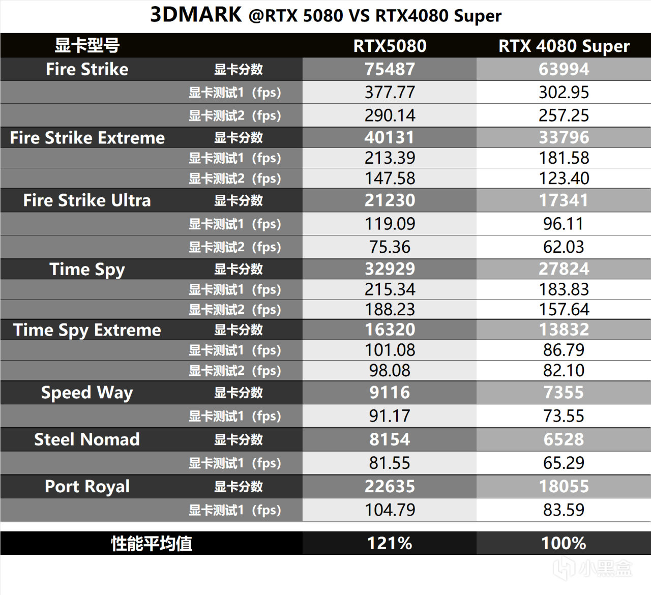▼3DMark的8項測試平均成績,RTX5080可以領先RTX4080s大概20%以上,在最重負載的Steel Nomad和Speed Way測試中,也取得了非常流暢的80~90fps。