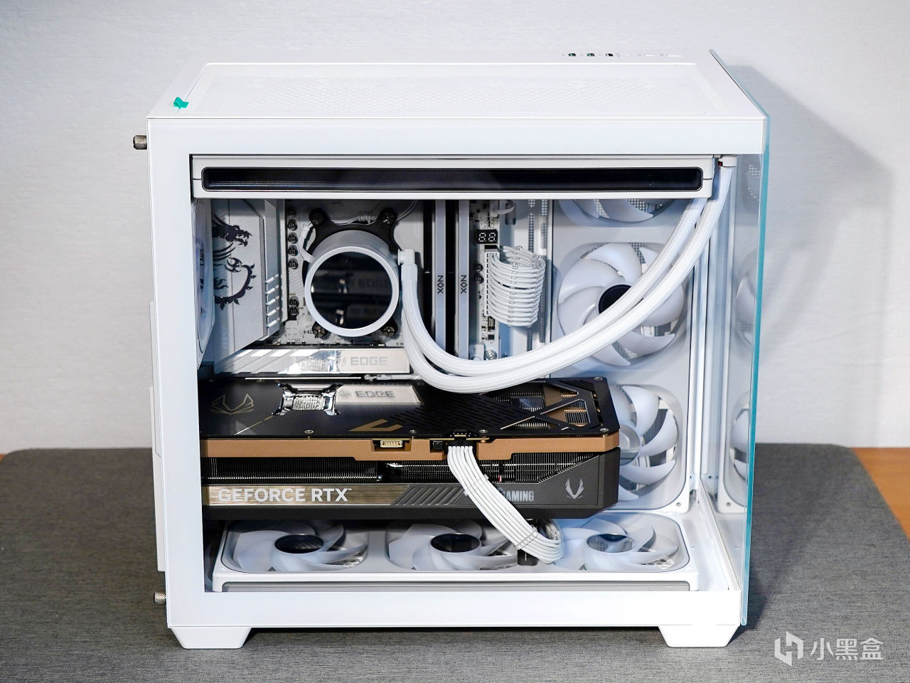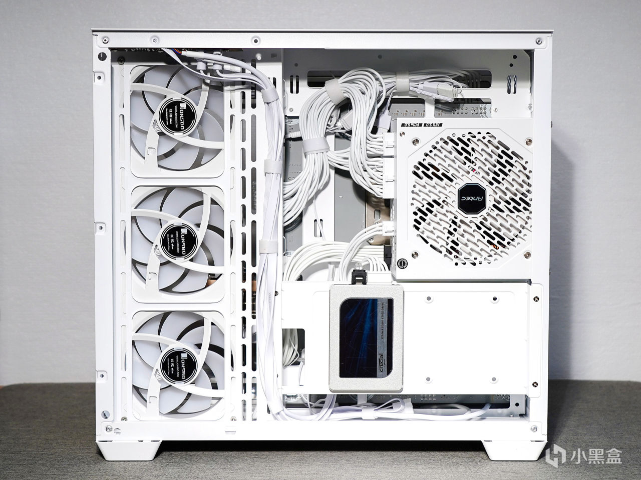 ▼海景房機箱的裝機還是非常簡單的,就不展示過程了。CG530的10個風扇位都安滿,底部裝ZB-360WR ARGB,後部裝FR-505WR(都是反葉風扇),用於進風;側面安ZB-360W ARGB,再加上頂部冷排的風扇(都是正葉風扇),用於排風。