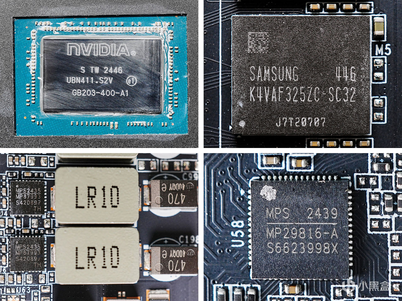 ▼GPU芯片型號爲GB203-400-A1,其大小和上代RTX4080基本一致;在GPU核心周圍共有8顆容量2GB的三星GDDR7顯存,速率達到了30Gbps。供電部分爲14+3相,電源管理芯片型號爲MP29816-A,DrMos也是來自MPS ,具體型號爲MP87993芯片,單顆最大持續電流達到90A,並搭配全貼片式固態電感和470uF的POS CAP固體電容。