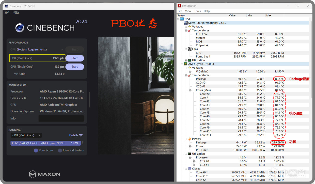 ▼PBO超頻狀態下,進行同樣的測試,表面packagae最高溫度爲89.4℃,12核平均溫度爲~80℃,TH-360算是hold住了,但如果是ADIA64 FPU烤機,溫度就會達到95℃的溫度牆。PBO的CineBench R24得分提高了6%,但功耗也從160w提高到了220W,代價還是不小的。