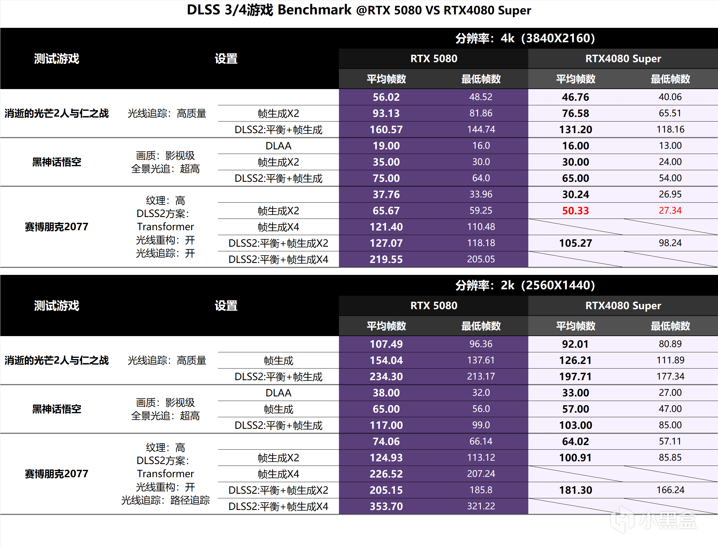 對一些硬件殺手級遊戲,就得首先開啓DLSS2或者降到畫質得到高一些的基礎幀數後,再開啓幀生成。從這個角度來說,RTX5080相比RTX4080S在4k分辨率開啓幀生成,出現問題機率要小不少。