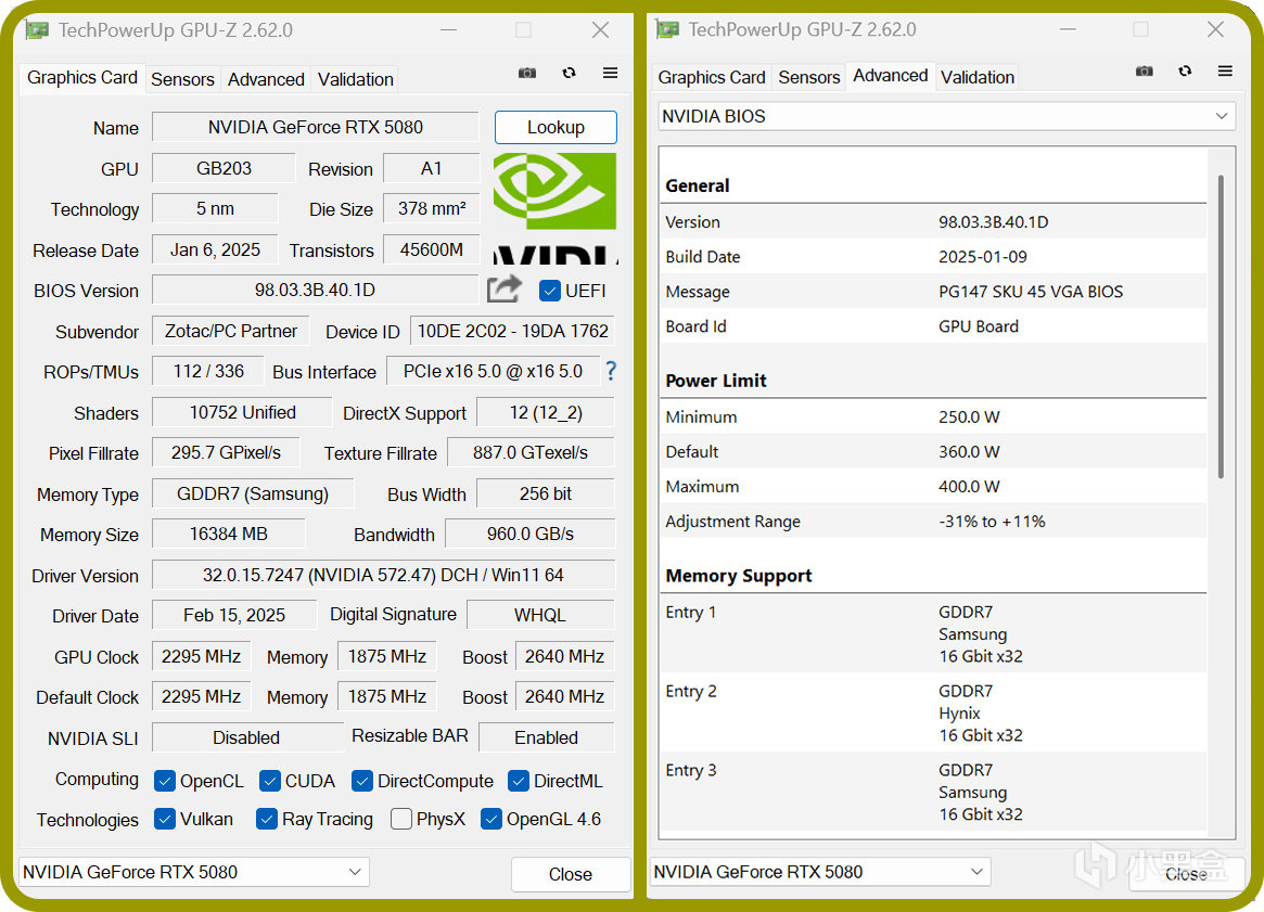 ▼顯卡的具體型號是索泰RTX 5080 SOLID OC,Boos頻率爲2640MHz,比公版要高一些。雖然貴爲次旗艦顯卡,但由於規模差不多是RTX 5090 D的50%,所以和旗艦顯卡的差距其實是非常大的。