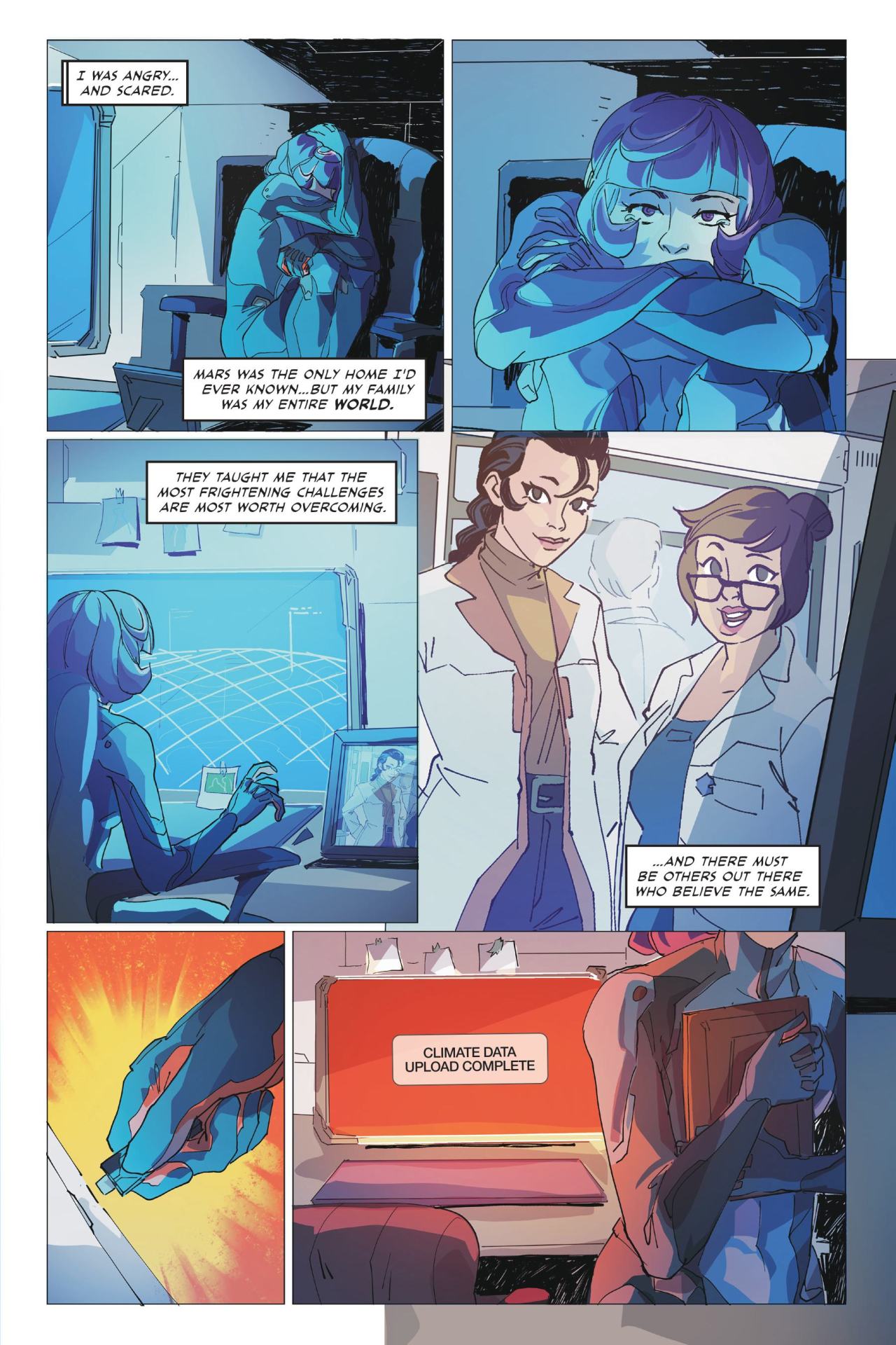 由於早已在火星生活多年,“朱諾”先遣隊所剩的物資只能保證一個人安全地飛向地球。踏上這趟旅途的人毫無疑問只有一位,那就是朱諾。儘管朱諾懇求父母不要送她走,可他們毅然決然。畢竟朱諾象徵着全人類的希望,他們不會讓女兒落得和自己一樣的命運。然而朱諾絕不會放棄自己唯一的家園、拋下自己僅有的家人。在她眼中,這次離別不是火星逃生,而是要去地球尋求援助。鄭重道別後,朱諾含淚離開了險象環生的母星,她明白此刻或許就是和家人們的最後一面。她在心中許下諾言,要找到一位能助她拯救所有人的幫手,而她必須抓緊時間。朱諾從小就聽母親講過許多故事,說的都是她在地球上的生活,其中有不少都指向一位老朋友:她是一名氣候學家,名叫周美靈博士。朱諾在地球上沒有其他線索,找到周博士就成了她的第一要務,她要找出一條道路,把幫手帶回家鄉。