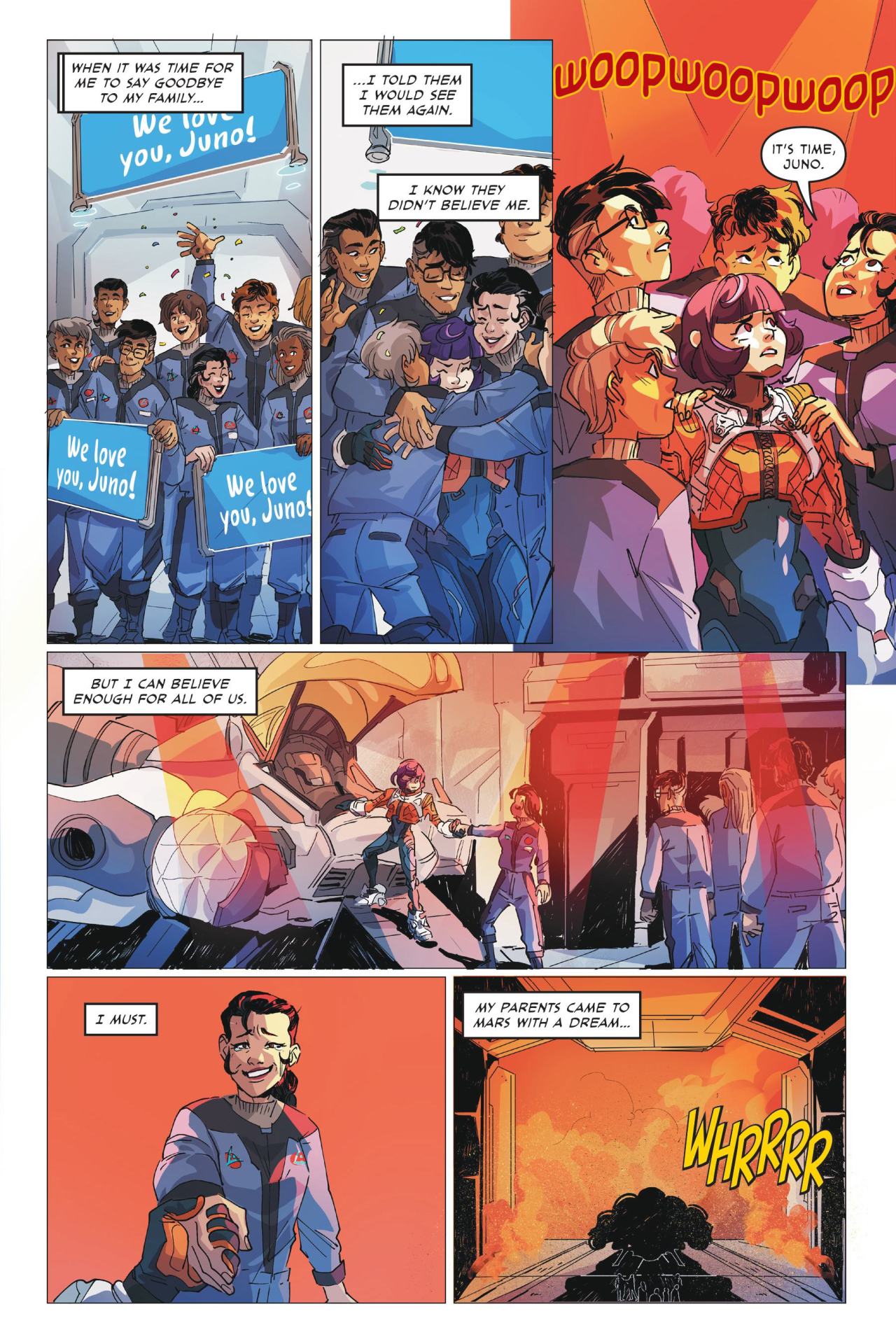 在莊嚴的告別中,朱諾含淚離開了她家鄉,因爲她知道她有可能再也見不到她的家人了。她告訴朱諾計劃的先遣隊員們,總有一天他們會再次相見。從他們的眼神中,朱諾可以看出他們並不相信這件事,但這並不重要。朱諾向自己保證,她會找到一個可以幫助她拯救所有人的人。她的父母帶着擴大人類影響力的夢想來到火星,現在拯救家園是朱諾的夢想。因此,她登上了她的船,連同火星基地的氣候數據,以及她母親和周美玲的照片 ,一起離開了火星。