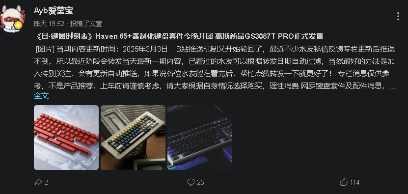 看每日鍵圈時刻就行了,非常用心的一位,消息搬的很全,基本上客製化的消息都及時更新,但是萌新入坑不必看見了就消費,多看看評論區,鍵圈屁事兒比較多,萌新容易因爲信息不對等被爛工作室坑錢。