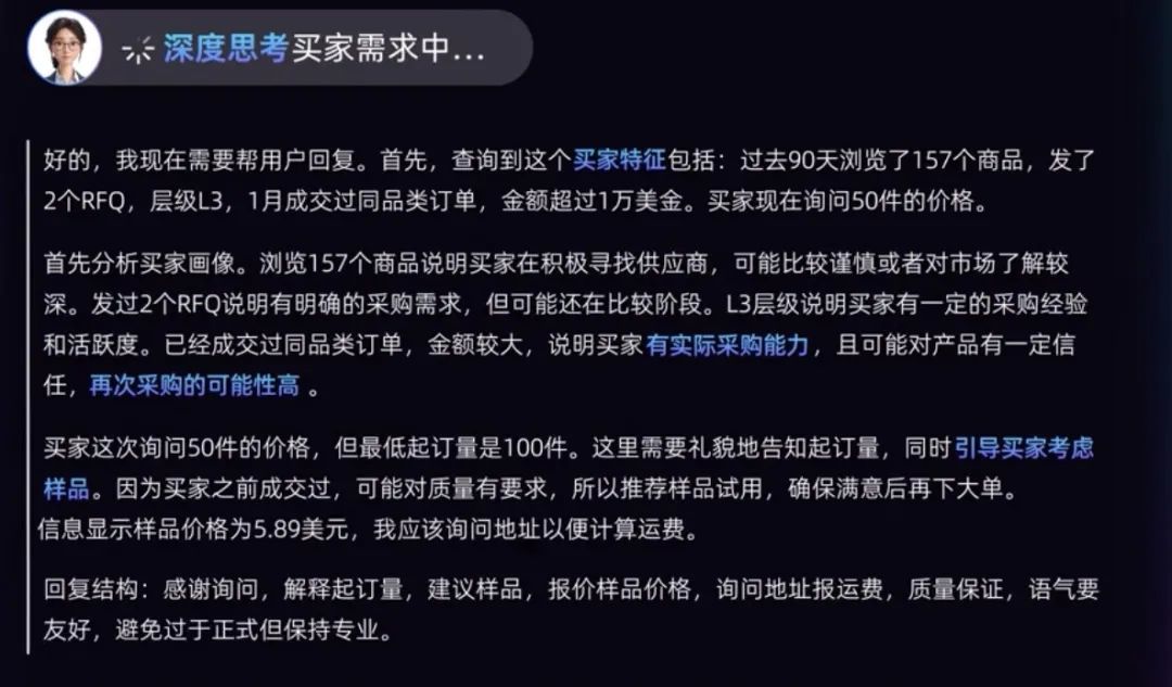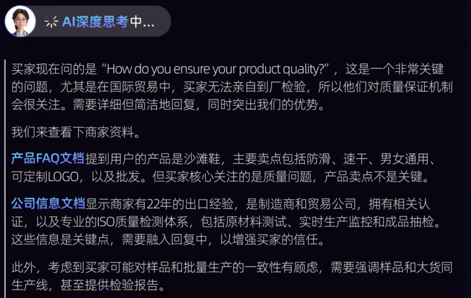北京時間凌晨 3 點,有國外買家找過來要採購 50 雙沙灘鞋,接待 Agent 先根據買家的特徵,分析了一波需求,再結合店鋪的實際情況,自動生成一段回覆。
