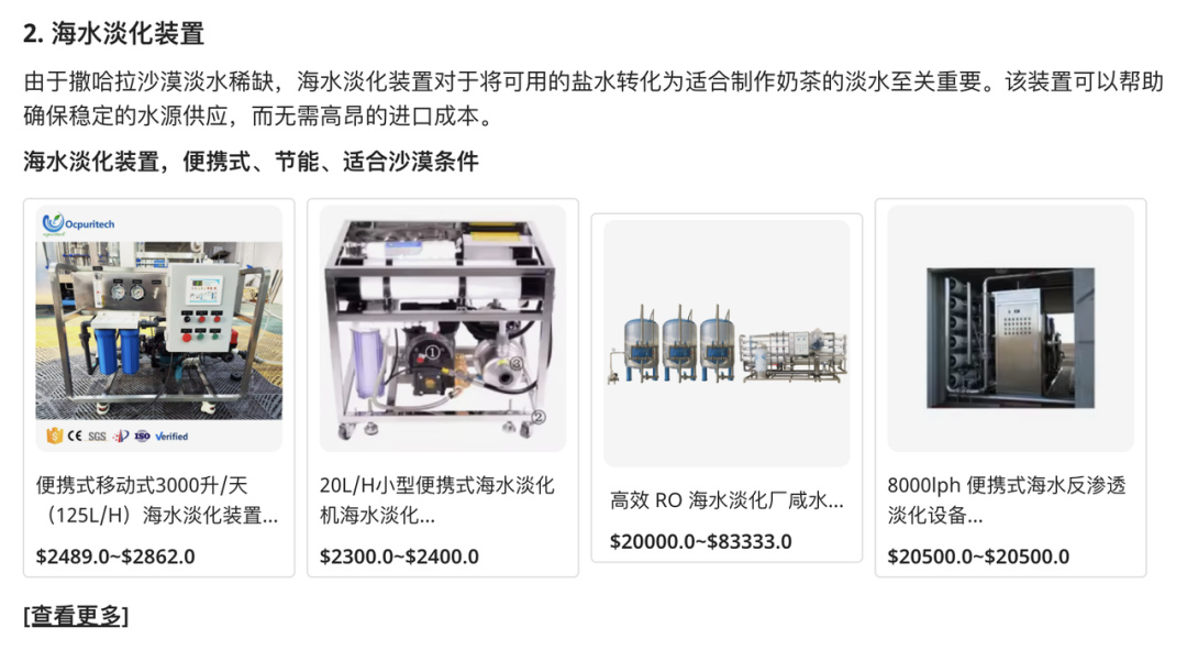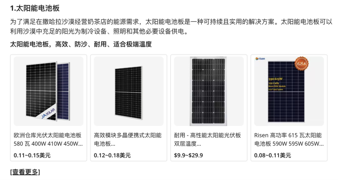 就比如我跟 Accio 說,我要在撒哈拉沙漠開一家奶茶店,它居然把外貿平臺阿里國際站上的供應商,都給我扒出來了。