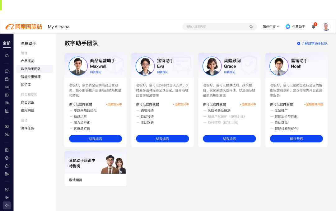 另外我還發現,阿里國際站除了 Accio 外,這次一起接入了 DeepSeek 、 Qwen 等推理模型的,還有面向國內賣家的 AI 生意助手,也就是 4 個 AI Agent 幫賣家打理外貿生意。