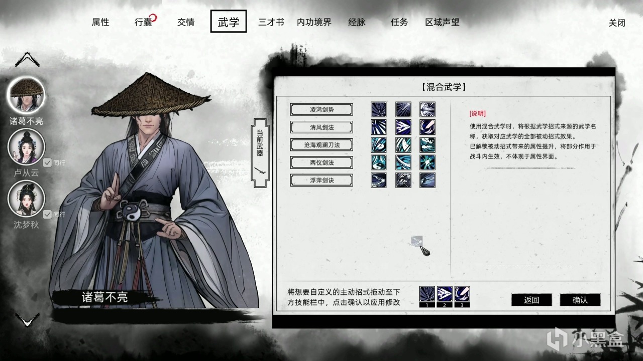 遊戲內十餘種武器供角色選擇(刀劍、棍棒、扇子、拳腿等),每種武器配有獨立的武學研本體系。玩家可以自由切換選擇武學心法,打通經絡,突破境界,提升武學造詣,成爲武林最強俠客!而遊戲發售後更新的武學混用玩法,使玩家可將各種武學中厲害的招式進行組合再搭配,打出專屬的強力連招。
