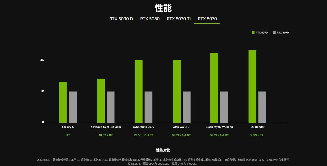 在3DMark理論測試中,RTX 5070對比RTX 4070平均性能提升約30%,甚至小幅超越RTX 4070 Ti和AMD RX 7900 GRE。其最大亮點在於DLSS 4技術,通過多幀生成和Transformer模型優化,在《賽博朋克2077》中開啓“光線追蹤:超速”模式後,4K分辨率下平均幀率達115幀,較原生性能提升超4倍。此外,2K分辨率下《CS2》《霍格沃茲之遺》等遊戲幀率均突破170幀,兼顧高畫質與流暢體驗。