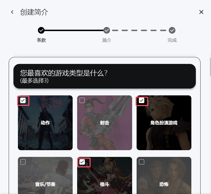 3、隨意選擇遊戲類型、最喜歡的遊戲模式、遊玩平臺、Beta、遊玩模式、年齡範圍並“繼續”