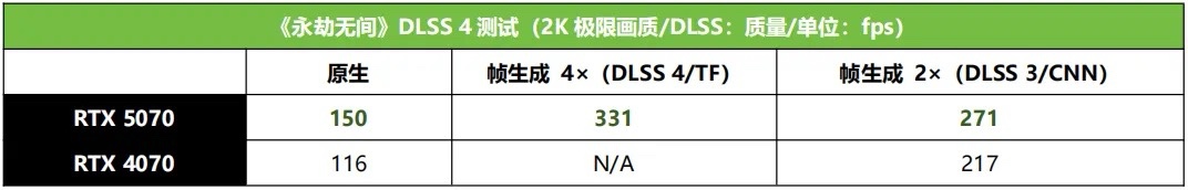 《永劫無間》新增了對DLSS 4的支持,在2K極限畫質下,RTX 5070開啓DLSS 4+4× 多 幀生成幀率可達331fps,相對原生下提升了121%,相對DLSS 3幀生成模式也提升了22%,相對RTX 4070的原生幀率更是提升了185%,相對它開DLSS 3幀生成大約提升了53%。