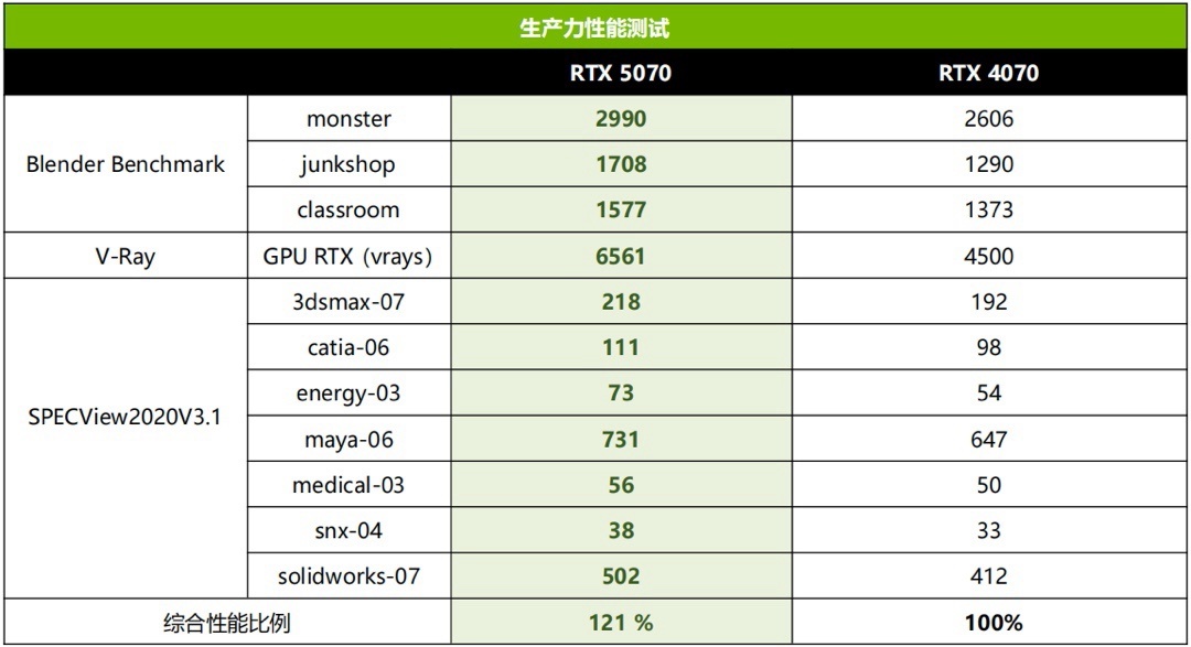 可見對於追求性價比的3D設計師來講,RTX 5070也是比RTX 4070更高效的選擇。當然,如果這些軟件加入了對DLSS 4的支持,那麼在實時預覽的時候RTX 5070的優勢還會巨幅提升。