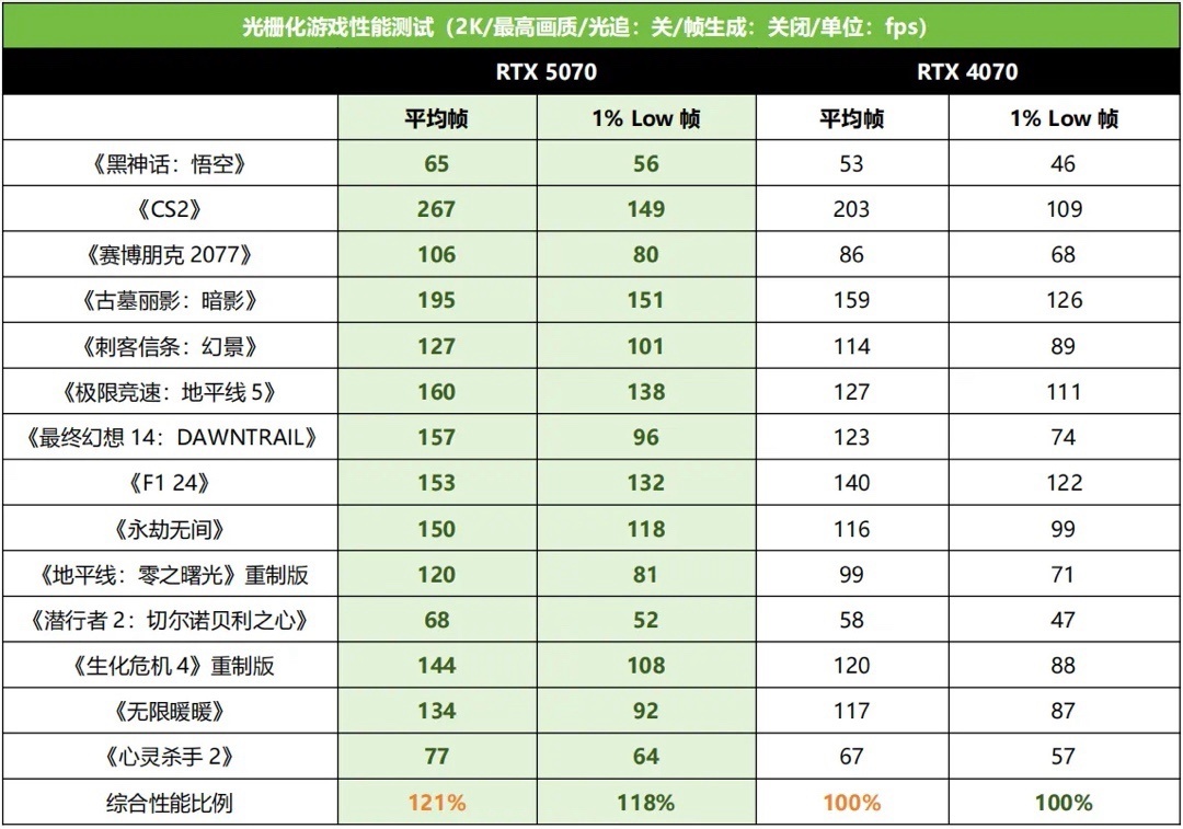 在2K極限畫質設定下,RTX 5070相對RTX 4070的平均幀率提升幅度大約在9%~32%,平均下來領先幅度大約爲21%。