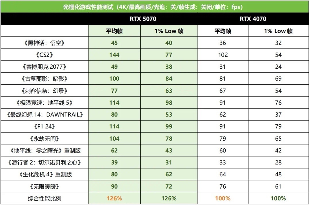 綜合全部遊戲來看,RTX 5070在4K極限畫質下的平均幀和1% LOW幀相對RTX 4070的領先幅度都達到了26%,比2K下又提升了不少。