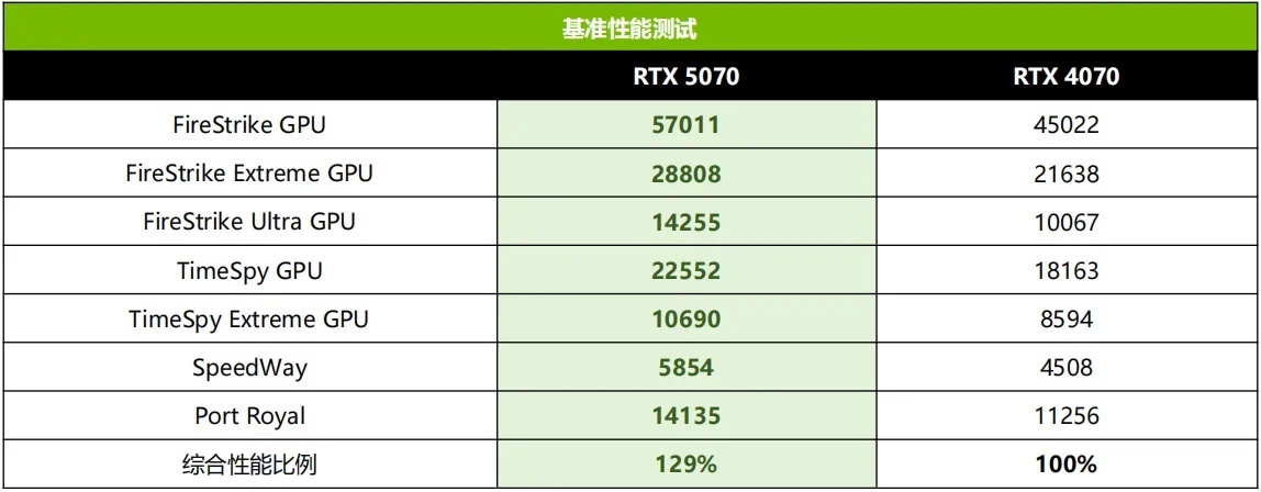 在DX11的FireStrike項目中,最高領先RTX 4070大約42%,而且可以看到隨着分辨率的提升,優勢也隨之提升,這與RTX 5070擁有更高的顯存帶寬不無關係。