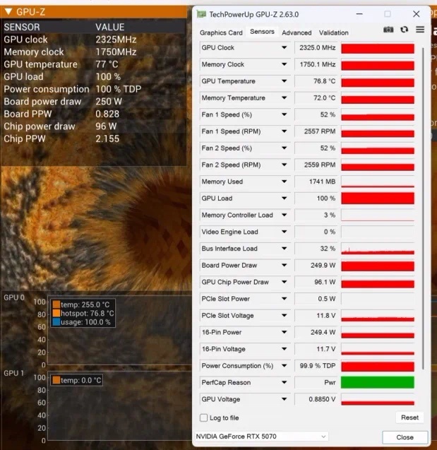 考機部分,RTX 5070 FE在整板功率滿載250W的情況下,GPU考機溫度在77℃左右,顯存溫度在72℃左右,對於公版的雙槽散熱器來說,這個散熱效果已經非常出色了。