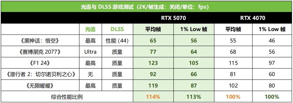 在常規的光追與DLSS遊戲測試部分,2K極限畫質設定下,RTX 5070相對RTX 4070平均幀率最高提升了18%,1% Low幀最高提升了22%,平均則分別提升了14%和13%,也比較符合預期的水準。