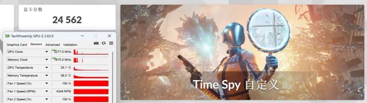 超頻部分,我們將整板功率上調10%,GPU加速頻率提升到了2853 MHz,顯存提升到了30Gbps。最終在3DMark TimeSpy GPU測試中,GPU最高頻率達到了3277MHz,TimeSpy GPU得分達到了24562分,相對默認設置提升了9%,這個幅度也比較令人滿意。