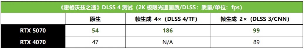 《霍格沃茲之遺》2K極限光追設置下,RTX 5070開啓DLSS 4+4× 多 幀生成幀率可達186fps,相對原生下提升了244%,相對遊戲自帶的DLSS 3幀生成模式也提升了88%,相對RTX 4070的原生幀率更是提升了296%,相對它開DLSS 3幀生成大約提升了一倍。