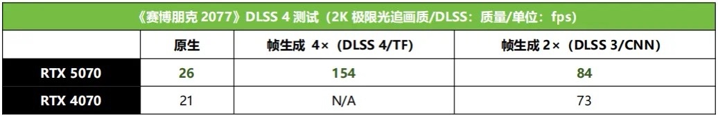 《賽博朋克2077》極限光追設置下對顯卡要求很高,RTX 5070在2K分辨率下不開DLSS和幀生成只有26fps。但是開啓DLSS 4+4× 多 幀生成之後,幀率暴增到了154fps,相比開DLSS 3幀生成的RTX 4070提升了大約83%,相對其原生幀率更是提升了633%。由此可見,在DLSS 4+多幀生成的支持下,RTX 5070相對上代產品有着巨量的性能提升,並且讓玩家可以在2K極限光追設置下輕鬆享受過百幀的遊戲流暢度。