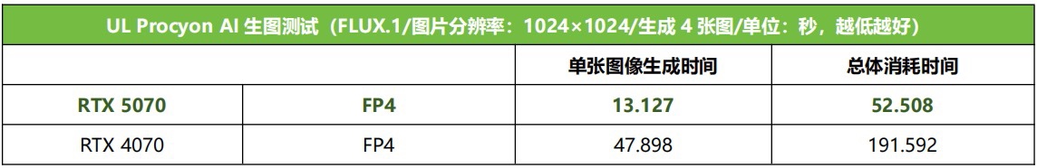 RTX 5070原生支持FP4精度,在UL Procyon的FLUX.1 FP4出圖測試中的速度達到了原生不支持FP4精度的RTX 4070的3.65倍,可見在未來的AI應用中,RTX 5070也能提供比RTX 4070更高的處理速度,爲用戶帶來更高的工作效率。