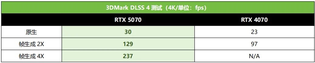 RTX 5070 顯卡在3DMark理論性能測試中,比上代的RTX 4070性能提高25%-30%,但在遊戲測試中,開啓DLSS 4之後,比RTX 4070的DLSS 3的幀率最少也有80%以上的提升,最極端的情況下甚至能有200%的提升。