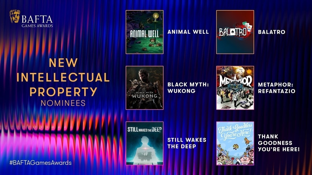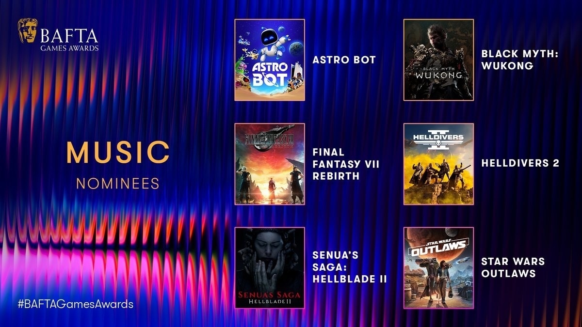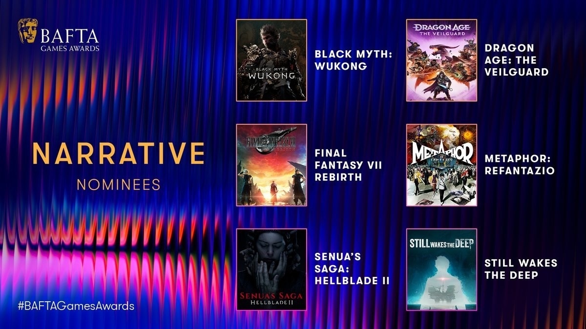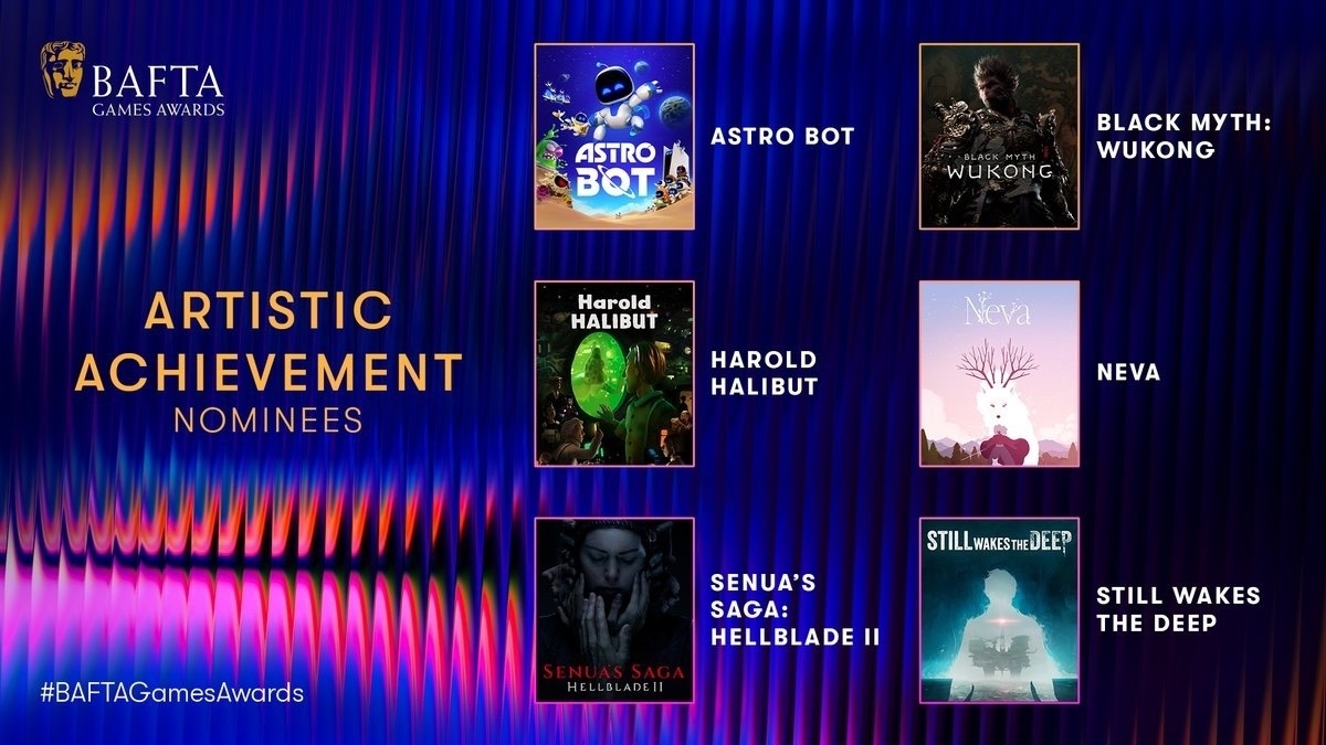 比较有趣的是作为本地游戏的地狱之刃2目前来看是BAFTA奖的最大赢家,获得了最佳艺术提名在内的总共11项提名,宇宙机器人获得8项,黑神话获得6项,黑神话具体的名单如下: