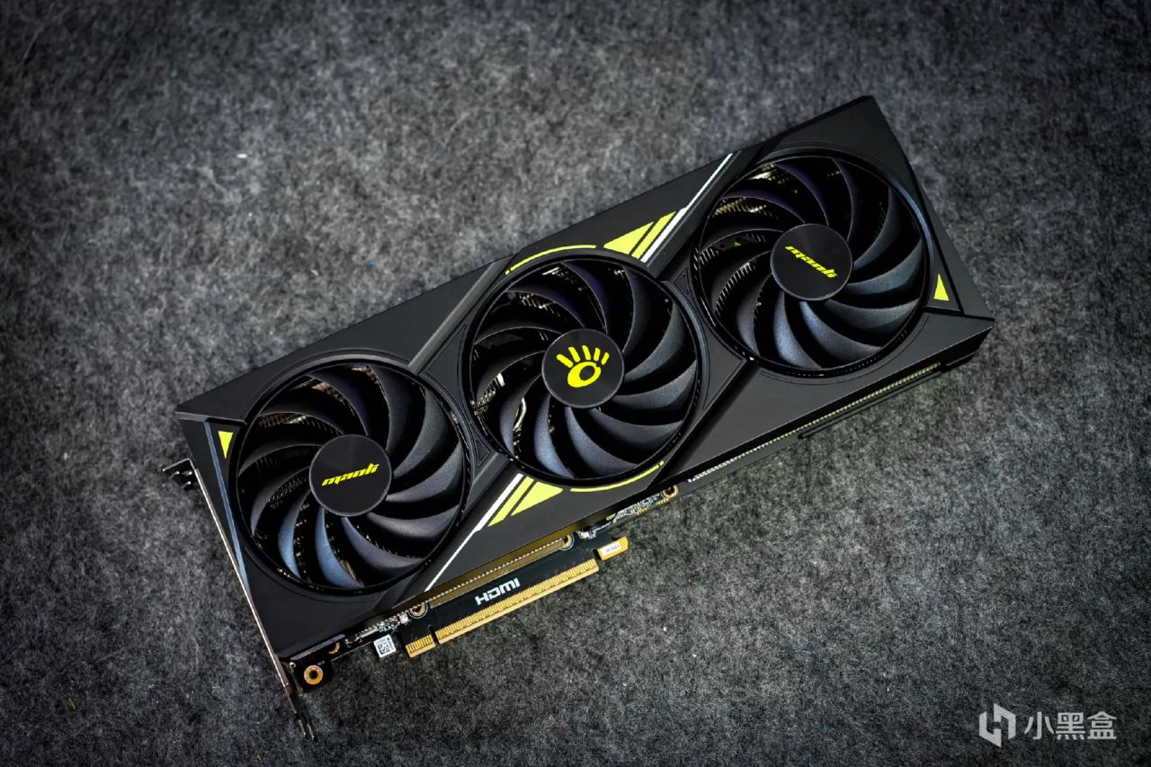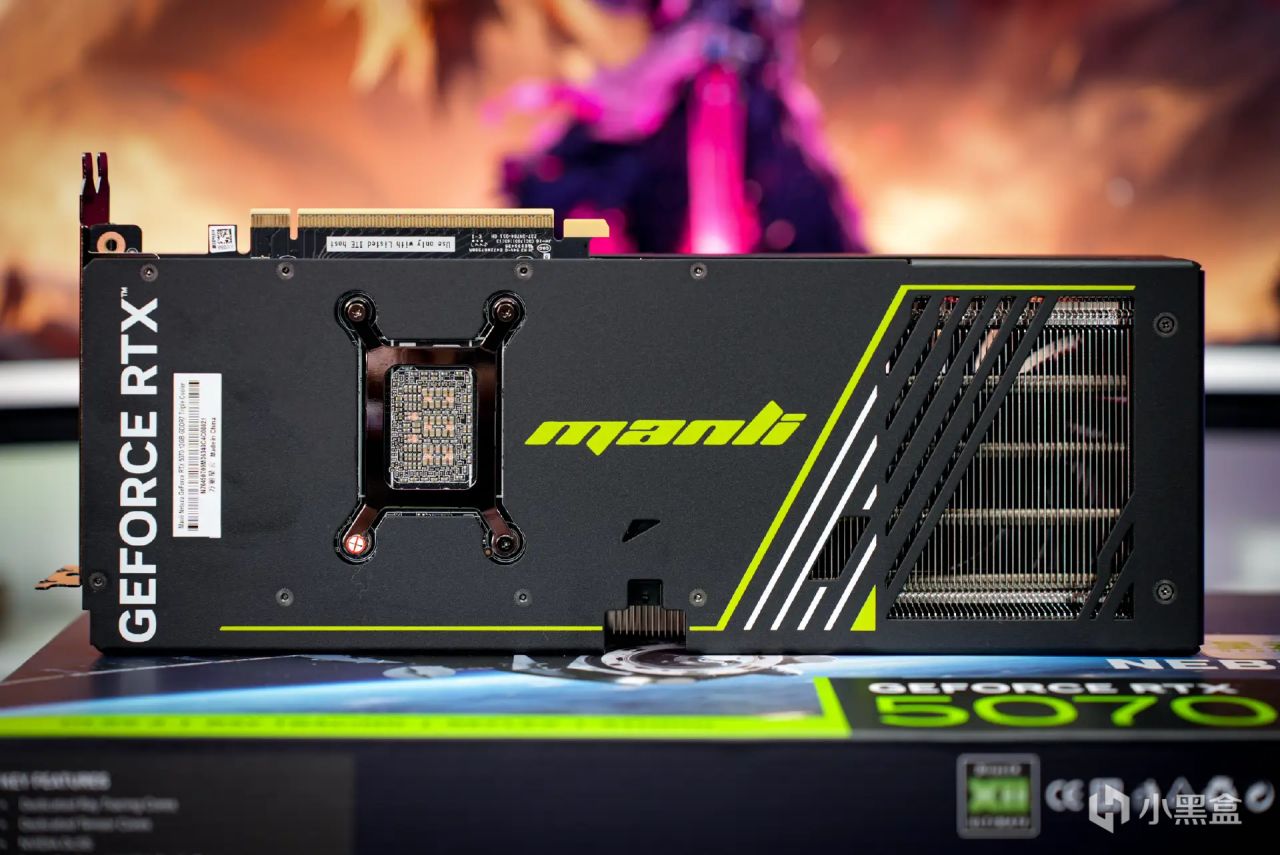 外觀設計方面,萬麗星雲GeForce RTX 5070給人的感覺的比較內斂,整個導風罩爲全包圍設計,配色也是萬麗的一貫作風——黑色+綠色,看上去也具備一定的辨識度。