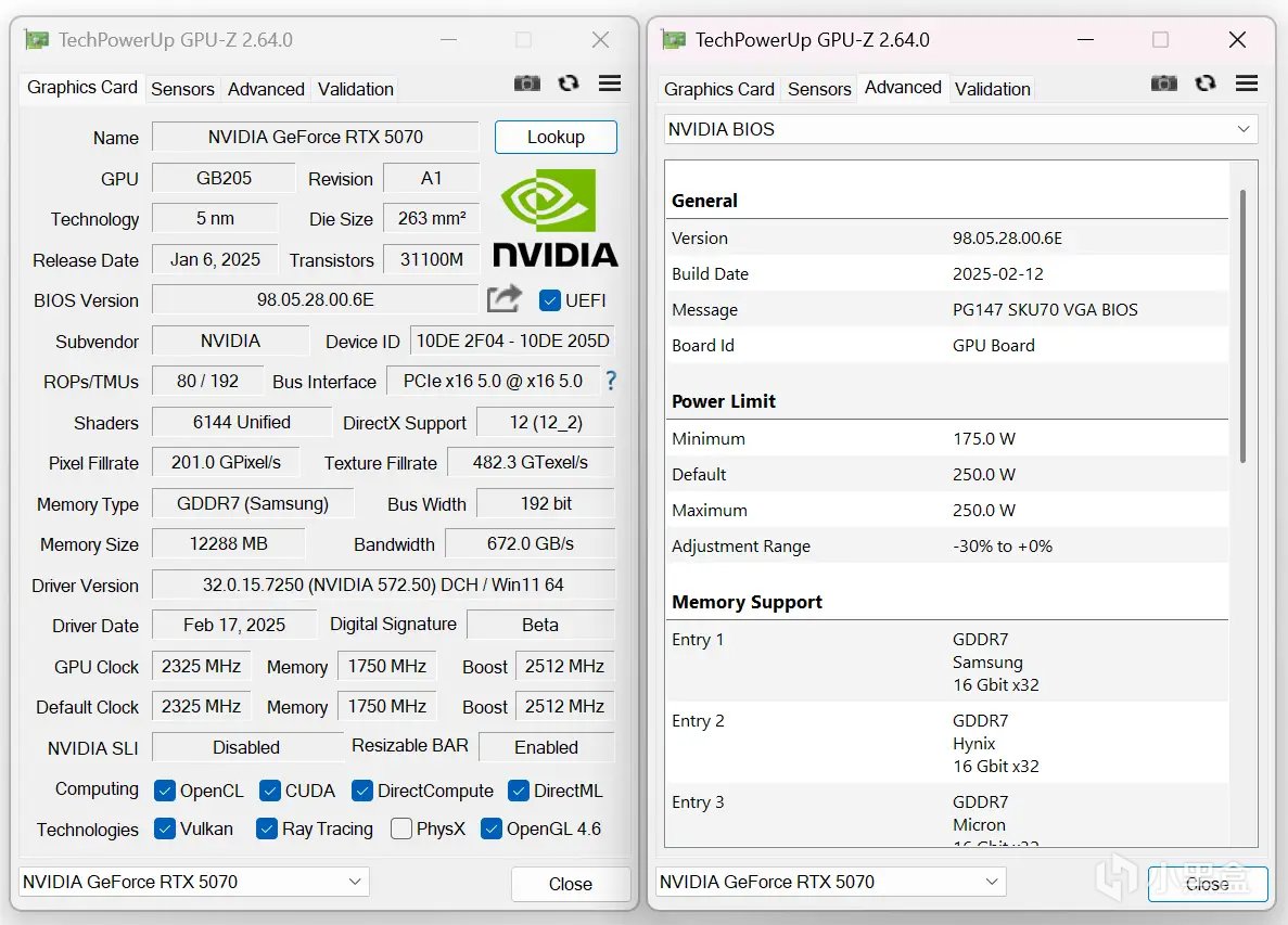 先來看看CPU-Z給出的詳細信息。萬麗星雲GeForce RTX 5070使用的GPU核心代碼爲GB205,具備6144個流處理器,光柵單元80顆,紋理單元192顆,顯存爲12GB GDDR7,位寬192bit,帶寬爲672GB/s;不過,頻率方面要比RTX5070Ti高一點,其中GPU基礎頻率2325MHz,加速頻率2512MHz,TGP默認功耗250W。