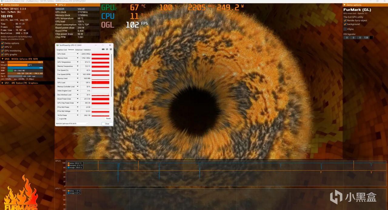 通過FURMARK拷機實測,在室溫24℃的環境下,拷機10多分鐘,萬麗星雲GeForce RTX 5070顯卡的功耗保持在250W左右,GPU拷機溫度僅爲67℃,尤其可見其溫控表現非常到位。