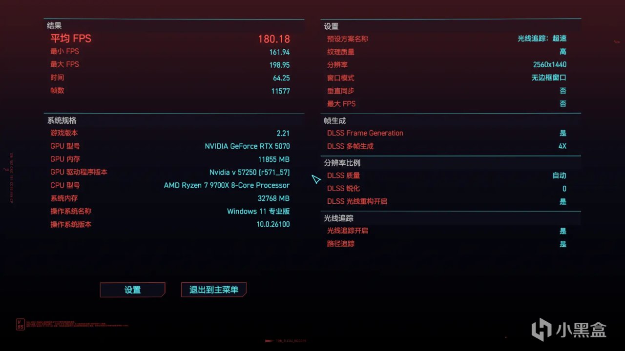 最後嘗試將分辨率設置爲2K分辨率,開啓光線追蹤:超速檔位,結合DLSS多幀生成4X的加持,遊戲的平均幀數能達到180FPS。