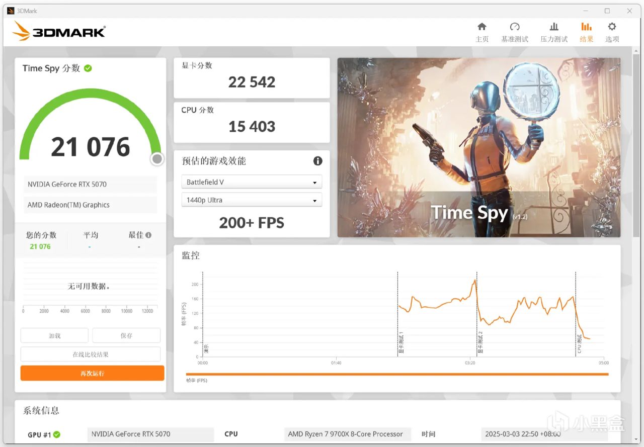 Time Spy測試,萬麗星雲GeForce RTX 5070的分數爲21076,其中顯卡分數爲22542。