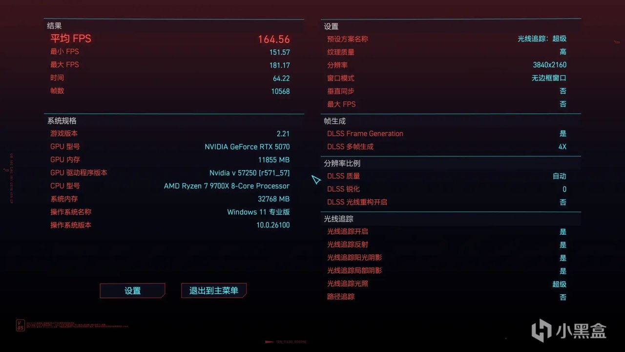 同樣在4K分辨率+光線追蹤:超級檔位上,結合DLSS多幀生成4X的加持,遊戲幀數能達到164.56FPS。