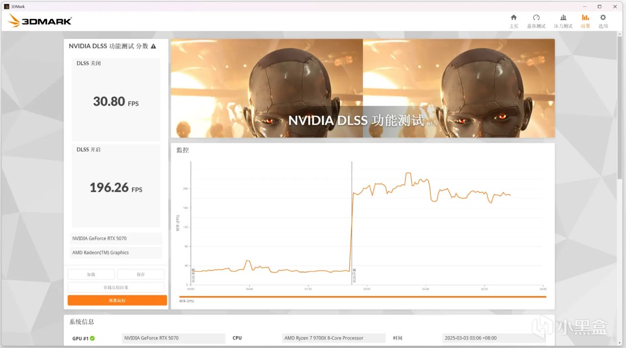 DLSS測試中,未開啓DLSS 4.0測試時,遊戲幀數爲30.8FPS,開啓後則暴漲537%,達到了196.26FPS。