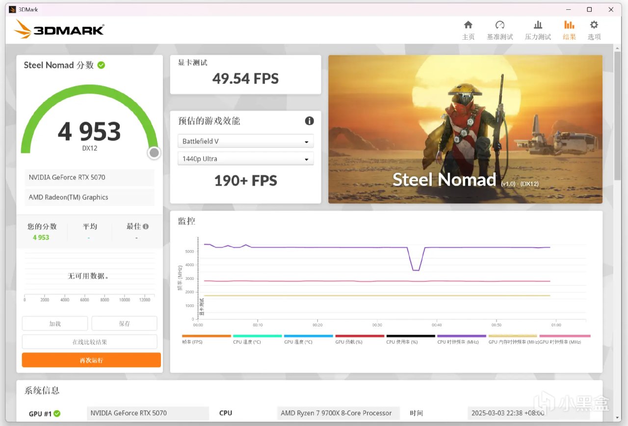 在Steel Nomad測試中,萬麗星雲GeForce RTX 5070的分數爲4953,其中顯卡測試成績爲49.54FPS。
