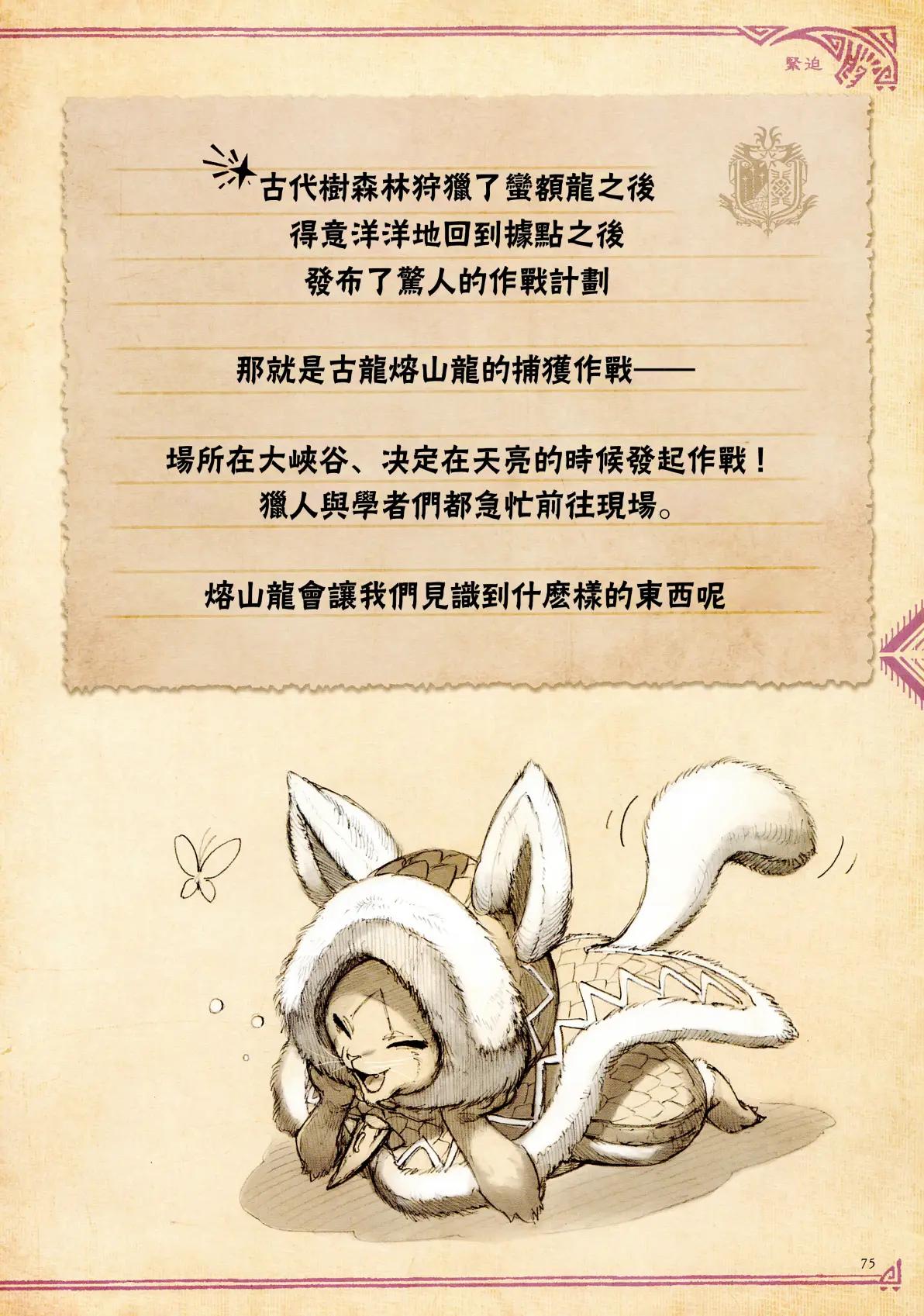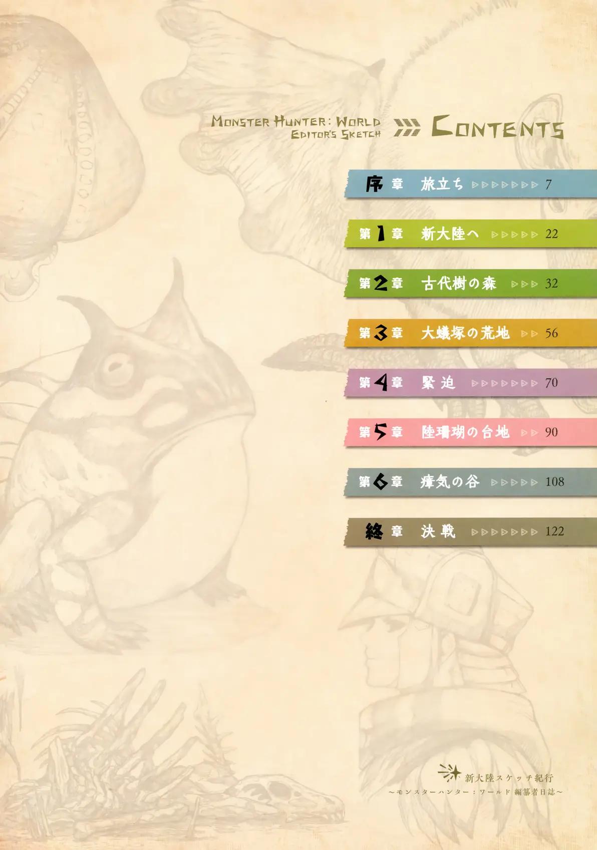 共分“踏上旅途”“前往新大陸”“古代樹森林”“大蟻冢荒地”“緊迫”“陸珊瑚臺地”“瘴氣之谷”“決戰”六個篇章,以書中人物“摩恩”的“新大陸”之旅爲線索,基於遊戲《怪物獵人 世界》內的設定,從怪物、環境生物等......