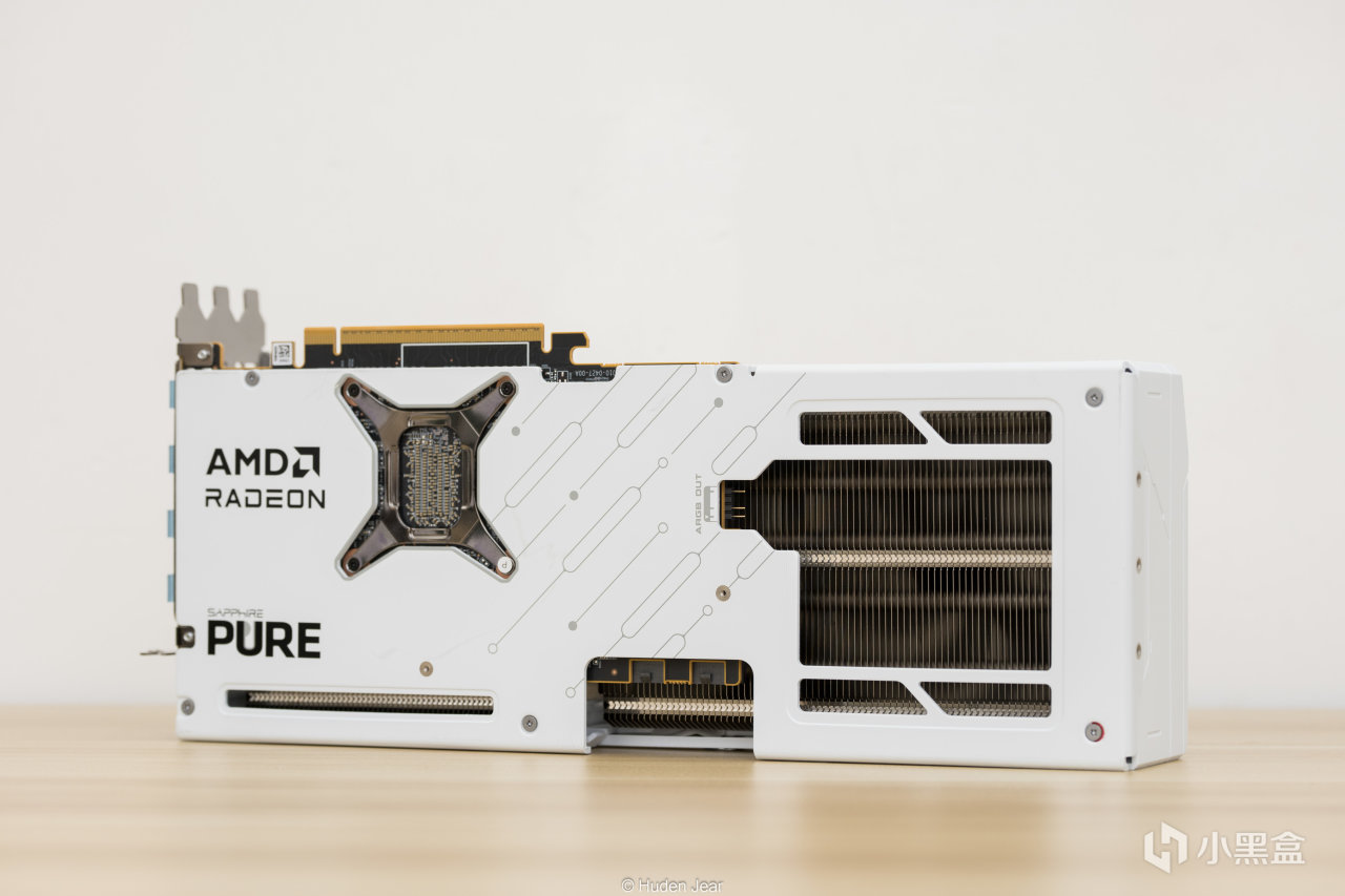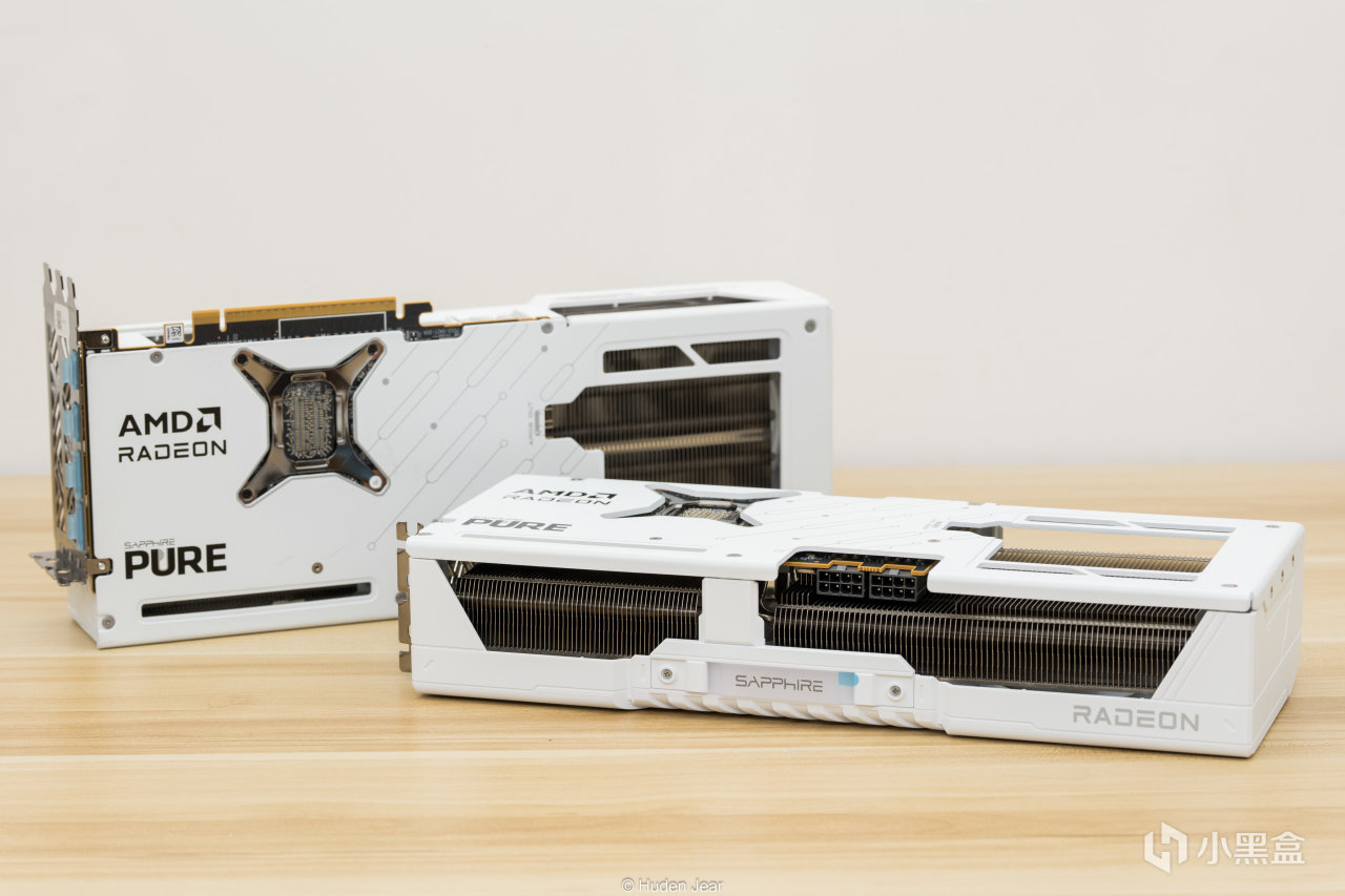 下面來看看顯卡的外觀,藍寶石PURE RX 9070XT和RX 9070都使用純白色外殼,和Pure的名稱非常搭,而且背板的顏值也是相當不錯,簡練的設計與合適的鏤空搭配,富有科技感的同時也做到了覆蓋保護PCB板與加強散熱