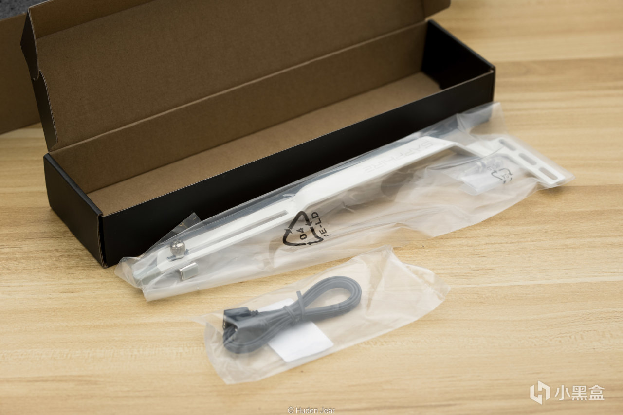 配件方面,除了一般顯卡都有的說明書和保修卡,藍寶石爲這張顯卡配備了一個顯卡支撐架以及一個ARGB延長線。支撐架也是純白,做工非常精細,延長線則是可以配合顯卡的ARGB接口實現和其他ARGB設備的同步